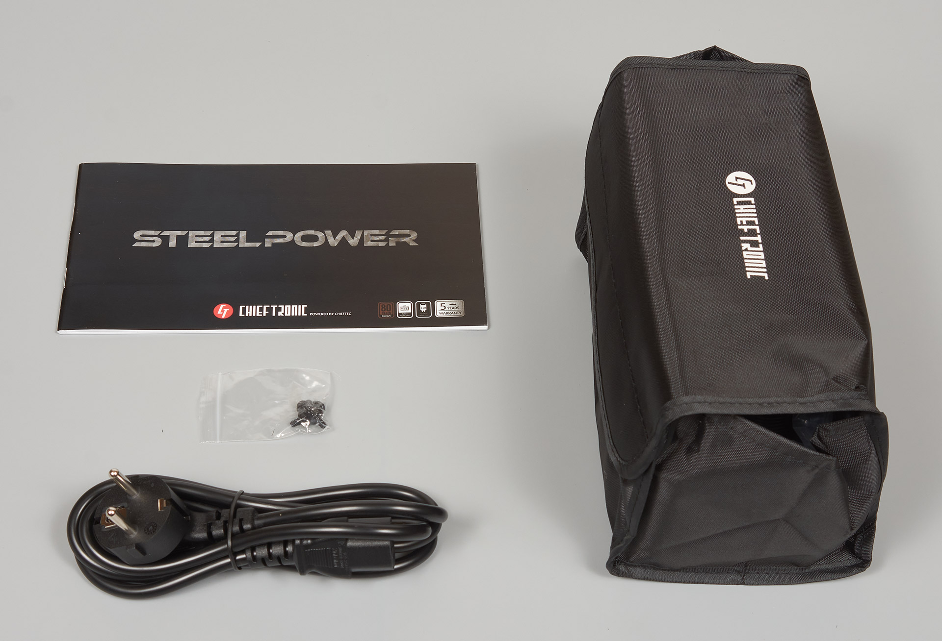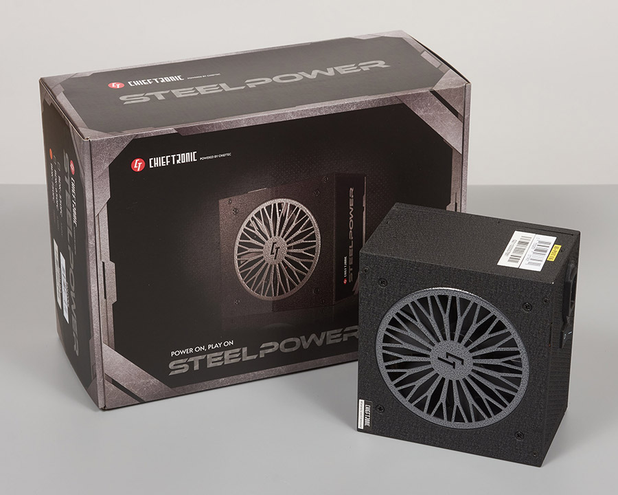 Блок питания поставляется в коробке средних размеров с качественной полиграфией, универсальной для всех продуктов этой серии. На передней грани расположено фото блока, на задней — информация о технических характеристиках всех устройств линейки SteelPower.