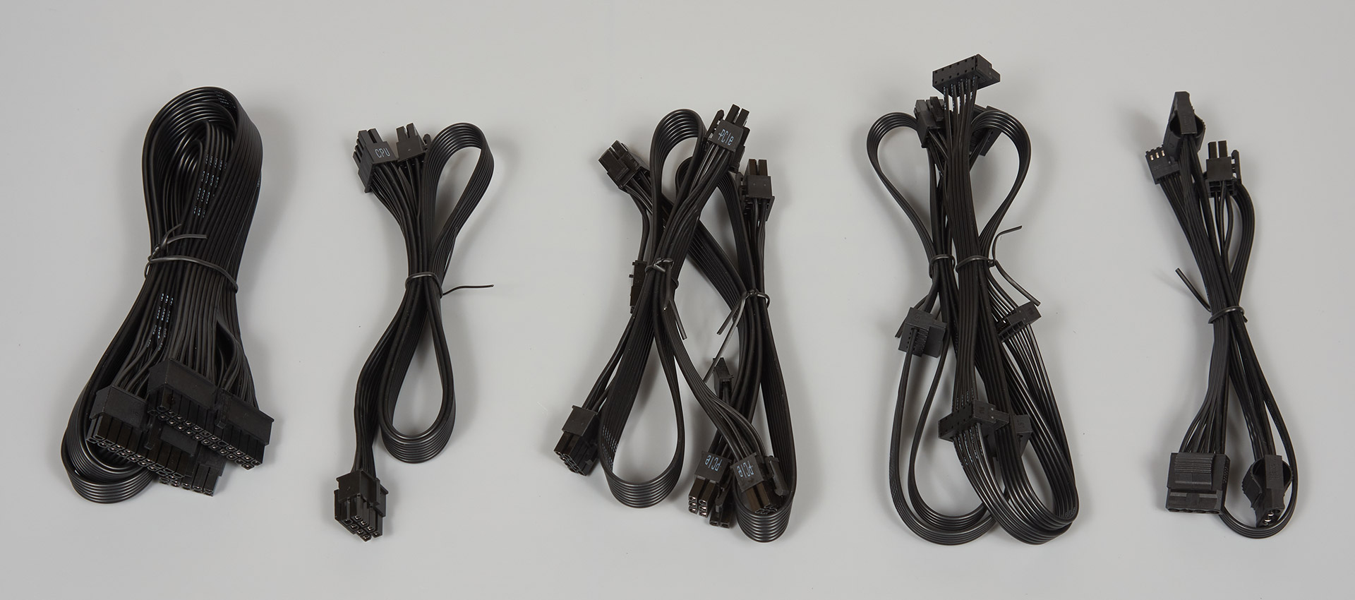 Все кабели выполнены в виде шлейфов с черной изоляцией, длина кабелей довольно большая, должно хватить для корпусов с нижним расположением блока питания.