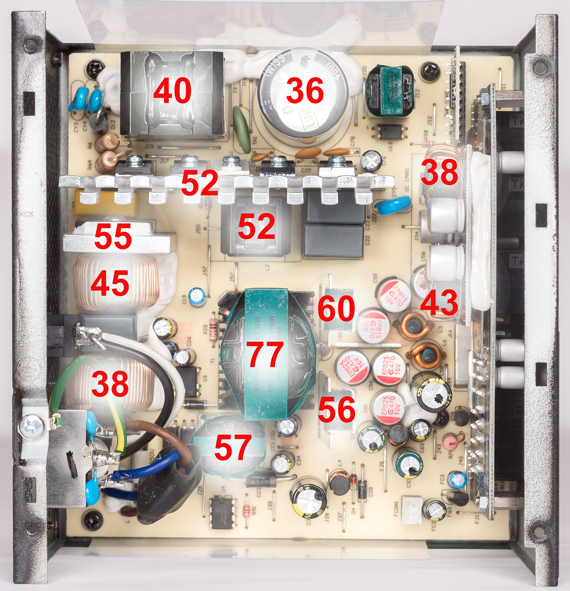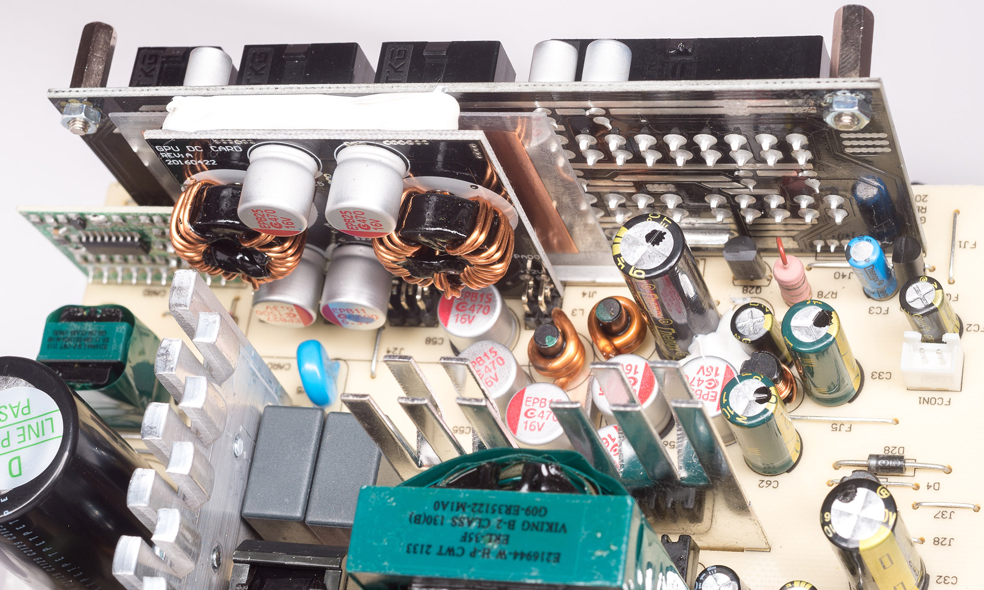Блок построен на современной платформе CWT: с активным корректором коэффициента мощности (APFC) и с широким диапазоном входного напряжения, с силовым резонансным LLC-преобразователем и синхронным выпрямителем по линии +12 В, а также DC/DC-преобразователями для линий +5 В и +3,3 В. Аналогичная схемотехника используется в «золотых» источниках питания.