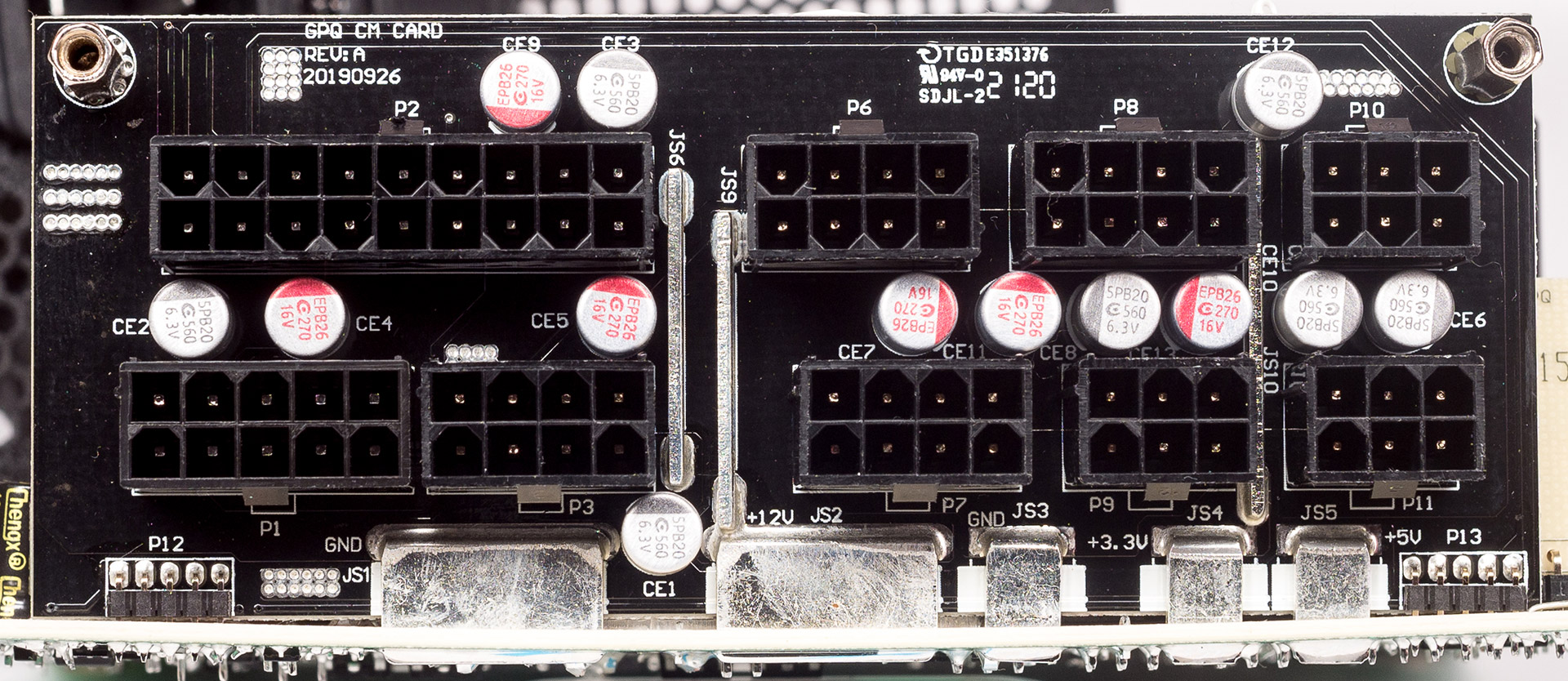 На плате подключения модульных кабелей установлены полимерные конденсаторы для дополнительной фильтрации выходных напряжений: шесть на 470 мкФ 16 В и семь на 560 мкФ 6,3 В.