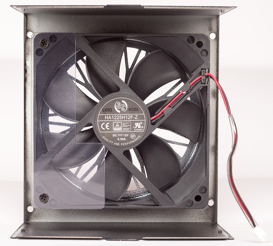 За охлаждение компонентов блока отвечает вентилятор типоразмера 120х120х25 мм с маркировкой HA1225H12F-Z (12 В, 0,58 A) с двухконтактным подключением. Вентилятор управляется автоматически в зависимости от температуры транзисторов синхронного выпрямителя по линии +12 В. После включения блока на холодную вентилятор работал на 750 оборотах в минуту и почти не шумел, с ростом температуры он должен плавно увеличивать скорость до максимальных 2200 оборотов в минуту.