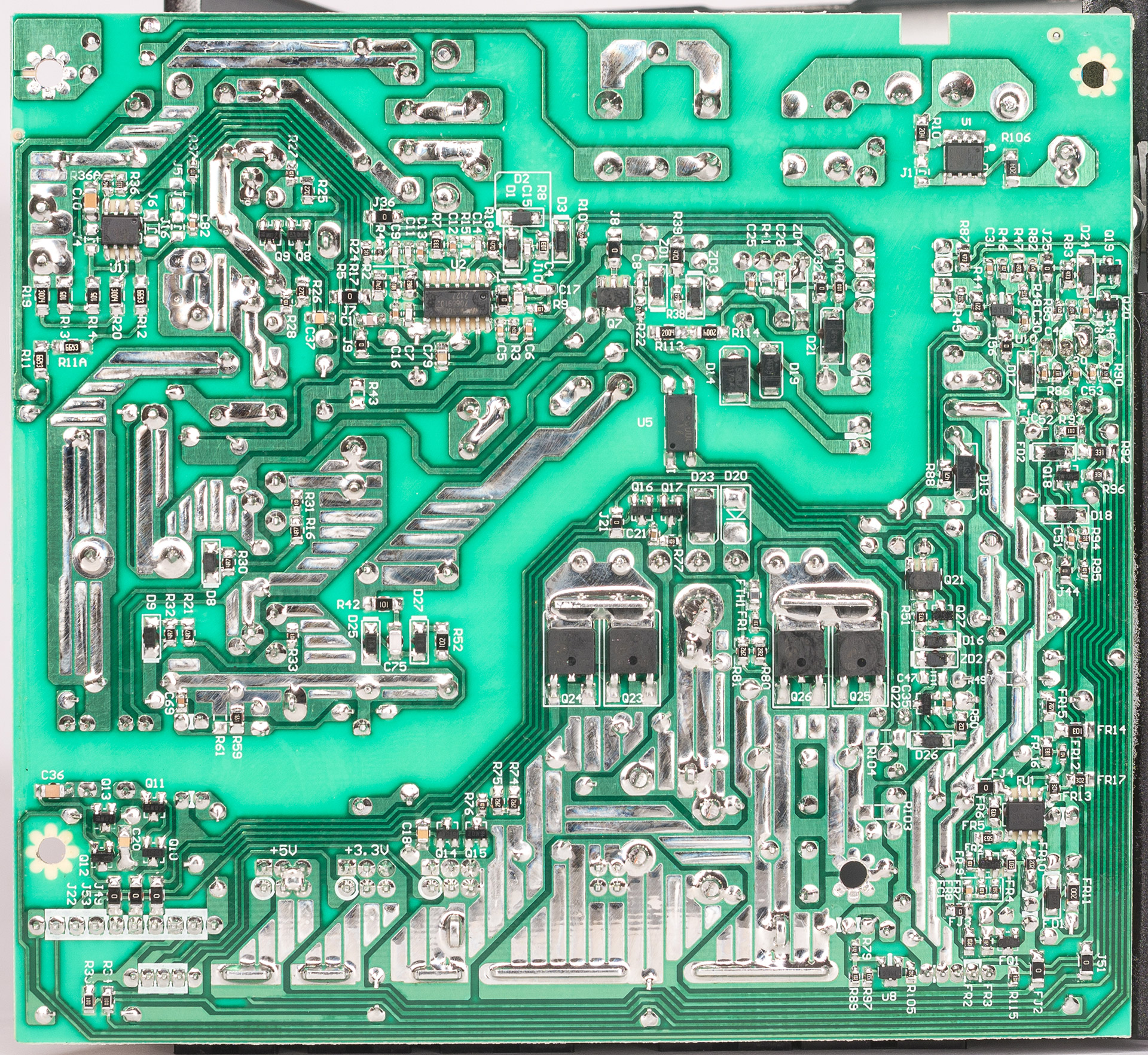 На входе распаян полноценный фильтр импульсных помех, часть его элементов находится на сетевом разъеме. Входной выпрямитель охлаждается небольшим отдельным радиатором, корректором коэффициента мощности управляет микросхема CM6500UNX. Высоковольтный фильтр выполнен на электролитическом конденсаторе емкостью 390 мкФ и напряжением 400 В с рабочей температурой 105 °C производства фирмы Nichicon.