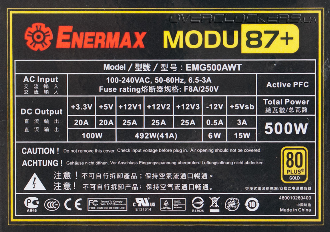 По характеристикам Enermax Modu87+ 500W ничем не отличается от конкурентов того же номинала. Три виртуальные линии на 12 В обеспечивают в общей сложности ток до 41 А (или по 25 А на канал), что соответствует 492 ваттам выдаваемой мощности — почти номинал устройства. Комбинированная мощность линий +3,3 В и +5 В равна 100 Вт, чего с лихвой хватит для современной системы, где основные потребители питаются от 12 вольт.