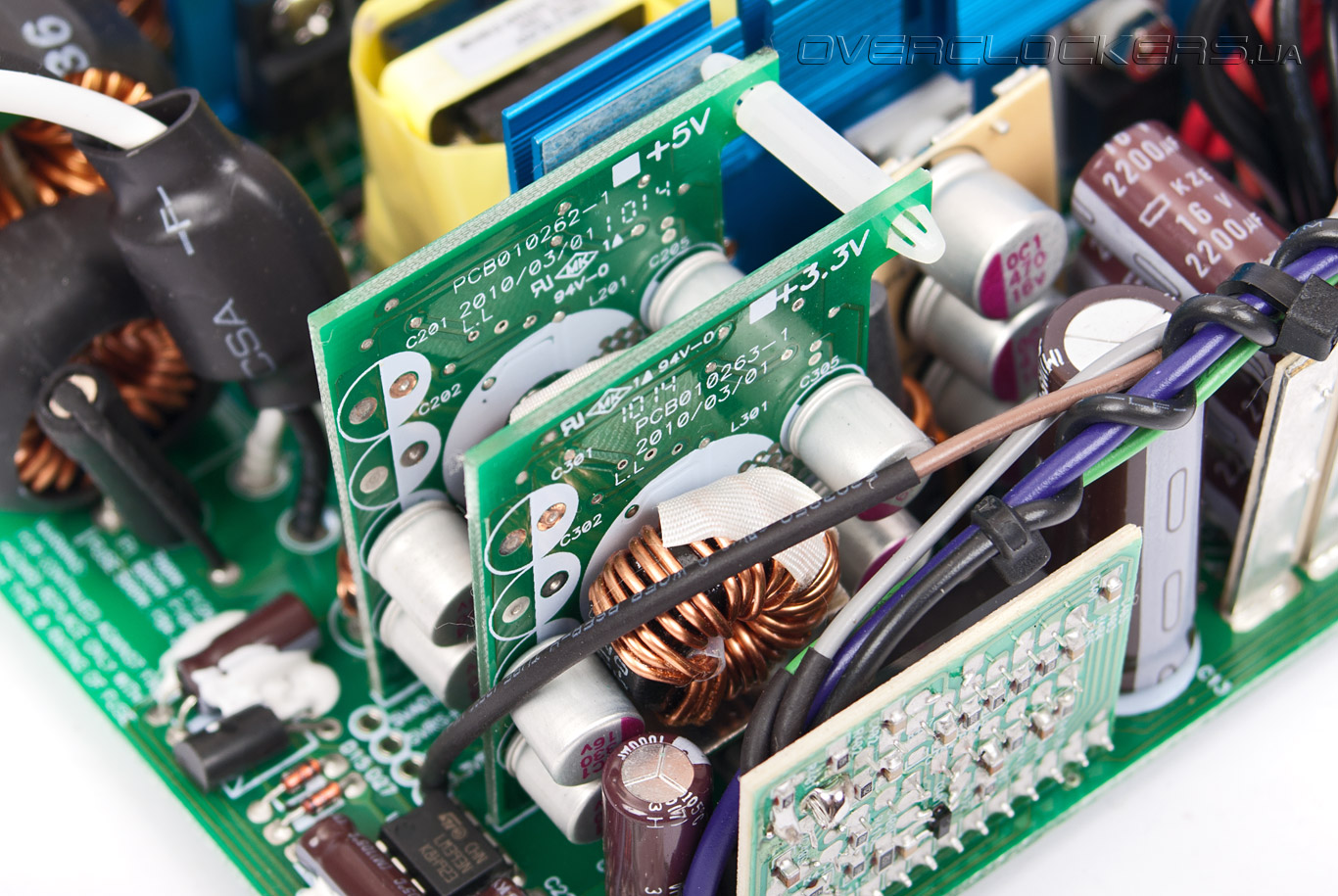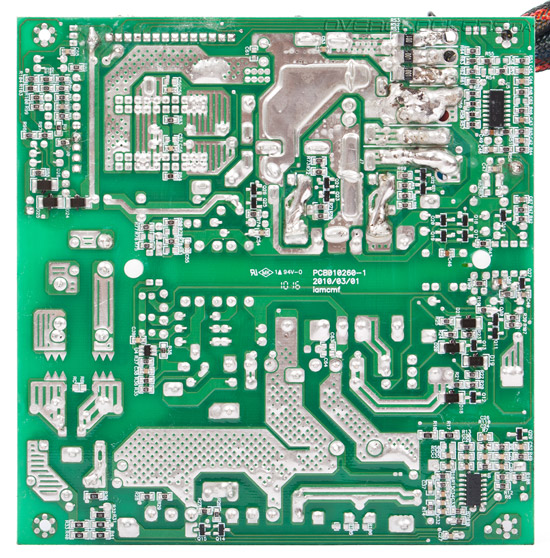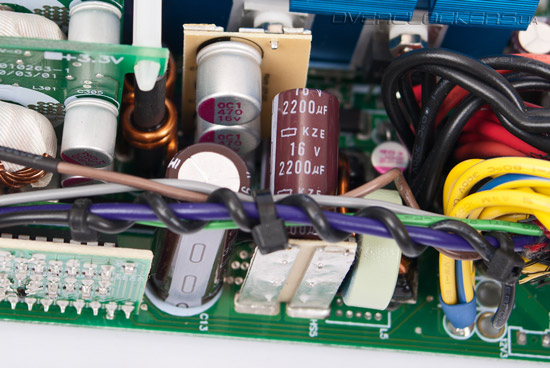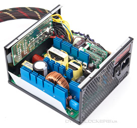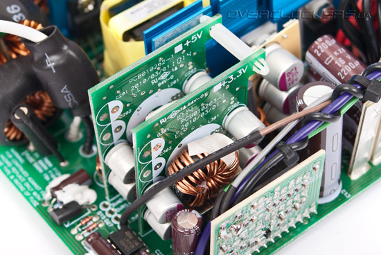 Из-за тесного расположения элементов блока конденсаторы выходного фильтра размещены на двух отдельных небольших платах. В их качестве не приходиться сомневаться — все же продукция United Chemi-Con серии KZE зарекомендовала себя хорошо. Помимо обычных электролитических конденсаторов также используются твердотельные.