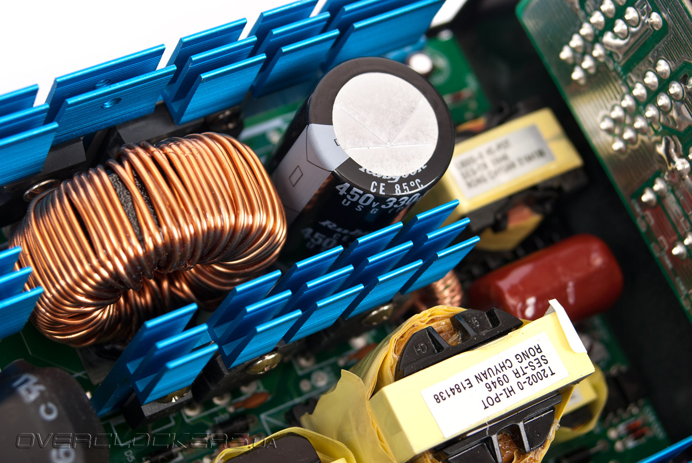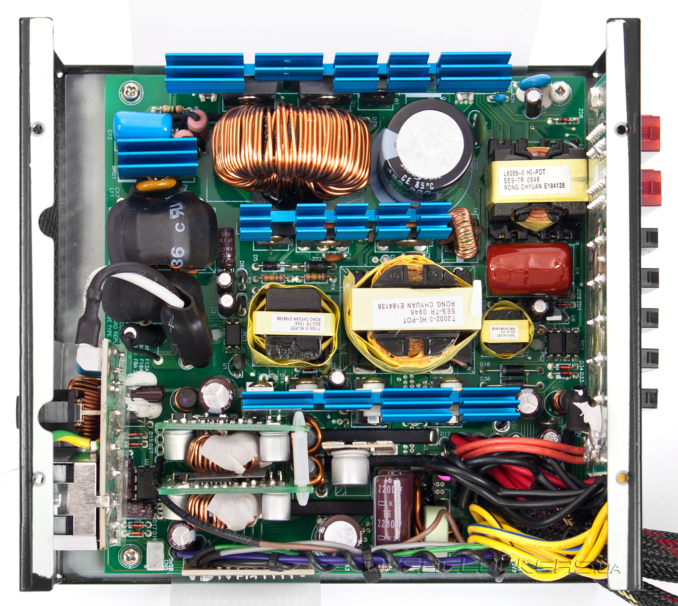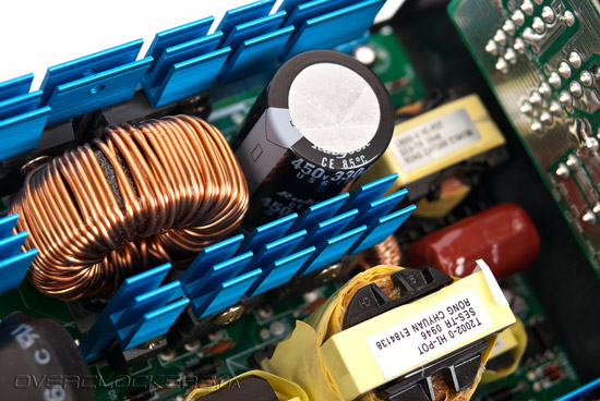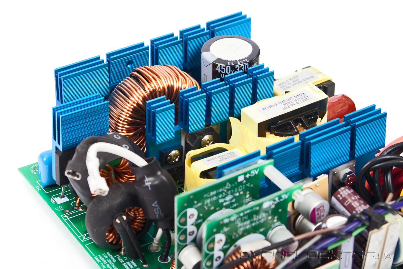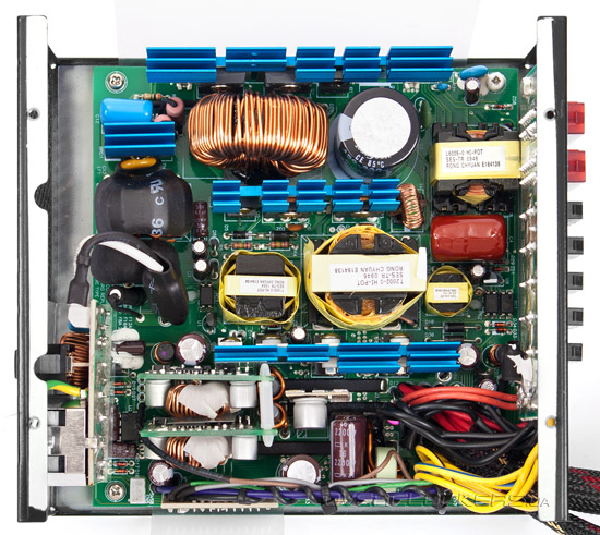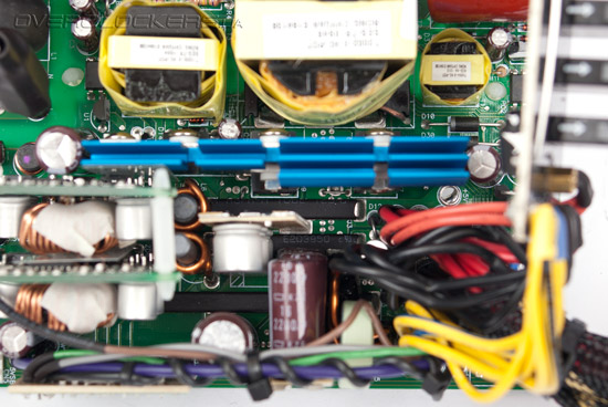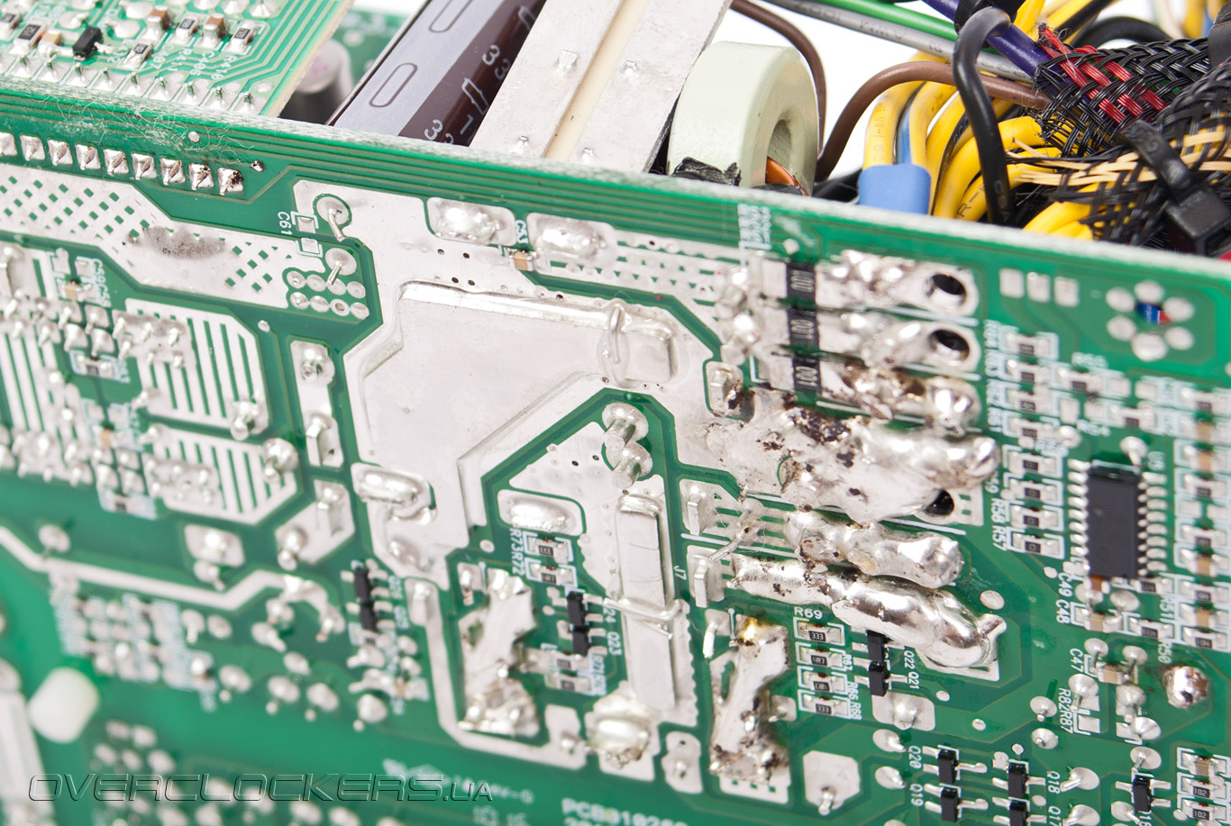 И если низковольтные транзисторы довольствуются небольшой металлической пластинкой для хлаждения, в виду малой нагрузки на них (максимум 100 Вт), то транзисторы канала +12 В передают тепло уже радиатору средних размеров. Он расположен сразу возле DC-DC преобразователей. Радиатор чуть меньших размеров также предусмотрен для ключевых транзисторов высоковольтной части блока питания, а самый крупный используется для охлаждения «мосфетов» активного PFC. Кроме того, крохотным радиатором оснащен диодный мост.