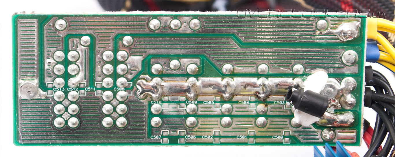 Плата, на которой распаяны разъемы, закреплена не очень жестко (всего две точки) и при подключении кабелей она немного прогибается. Вряд ли эта часть блока питания сломается от прикладывания чрезмерного усилия, но для спокойствия потребителей лишняя жесткость фиксации не помешала бы.