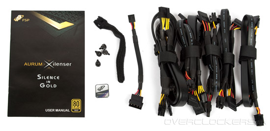 Комплект поставки соответствует топовым продуктам производителя и содержит: инструкцию, наклейку с логотипом FSP, три стяжки-липучки, крепежные винты с накатанной головкой, переходник для питания флоппи-дисковода и набор отстегивающихся кабелей.