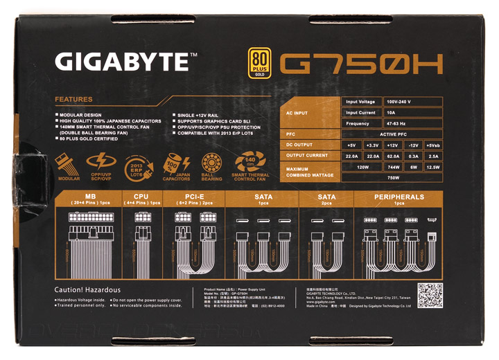 Блок питания GP-G750H, анонсированный зимой этого года, обладает модульной конструкцией и сертификатом 80 Plus Gold, отличающимся высоким КПД устройств, вплоть до 92%. Устройство поставляется в черной коробке с оранжевыми элементами, на обратной стороне которой расписаны основные характеристики продукта, кабели и ключевые особенности новинки. Тут стоить отметить наличие японских конденсаторов, единственную линию +12V и управляемый 140-мм вентилятор с двумя шарикоподшипниками.