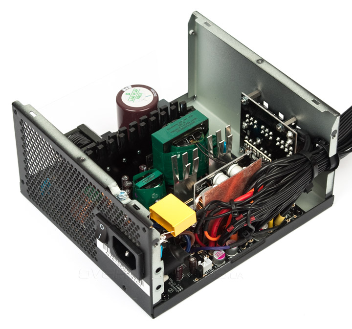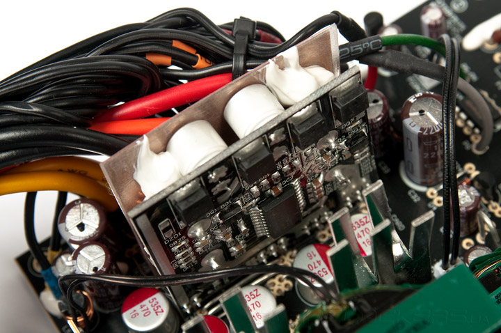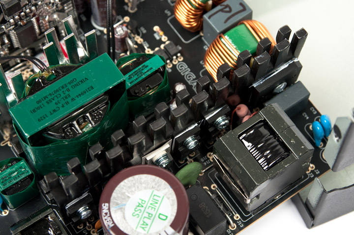 Для поддержания приемлемого температурного режима силовых элементов используется массивный алюминиевый радиатор с ребрами-лепестками на конце. Он общий для ключевых транзисторов, компонентов APFC и диодного моста. Синхронный выпрямитель довольствуется парой небольших стальных пластинок.