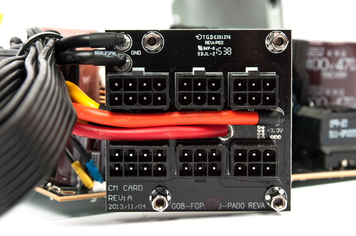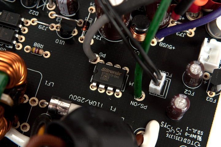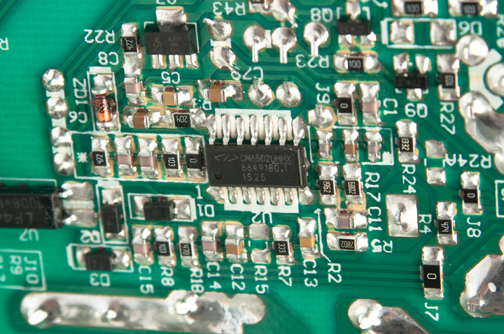 Управляется блок контроллером CM6901X, отвечающим за резонансный преобразователь и синхронный выпрямитель, расположенным на отдельной платке. Модуль APFC поручен чипу CM6502, установленному с обратной стороны основной PCB, а мониторинг всецело зависит от микросхемы Sitronix ST9S313-DAG, больше известной как SiTI PS113.