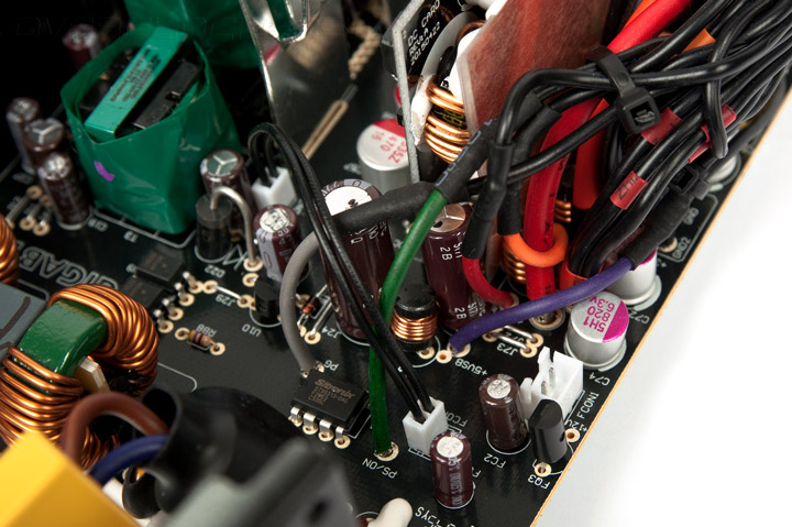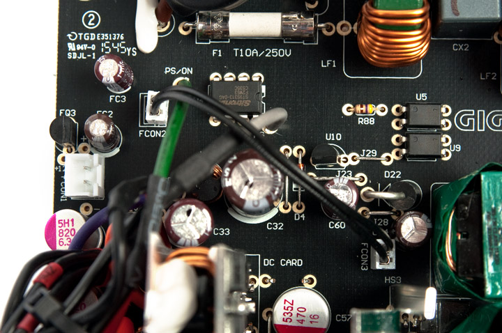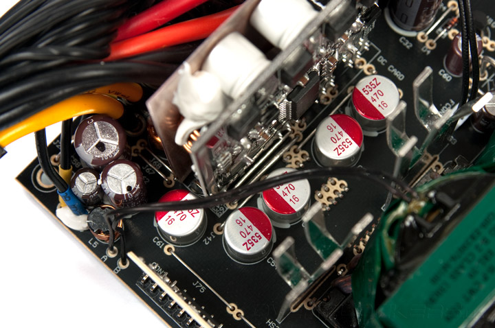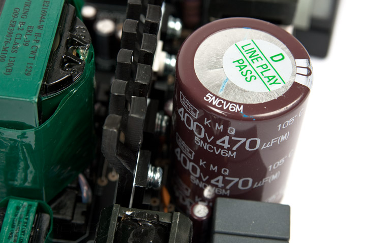 А вот что касается емкостей в целом, то здесь не экономили. На входе стоит конденсатор на 470 мкФ с рабочим напряжением 400 В производства японской Nippon Chemi-Con. Емкости той же компании распаяны в остальных цепях, есть даже полимерные конденсаторы. С такими элементами блок просто обязан работать в полупассивном режиме, но так ли это, мы узнаем ниже.