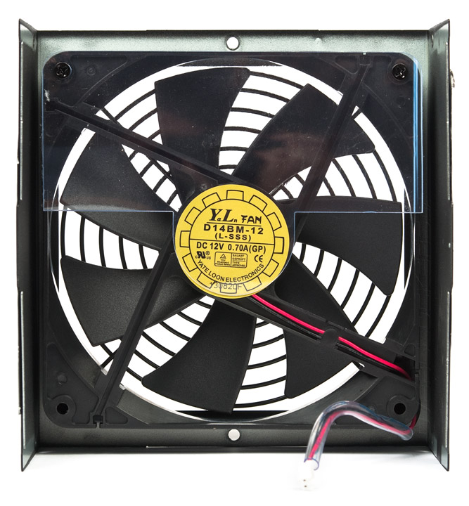 Обдувается блок 140-мм вентилятором D14BM-12 производства Yate Loon Electronics с двумя шарикоподшипниками с максимальной скоростью вращения крыльчатки 1400 об/мин. Заявленный уровень шума 29 дБ, подключение — двухконтактное. Для направления потока воздуха предусмотрена пластиковая пластина, перекрывающая половину «карлсона».