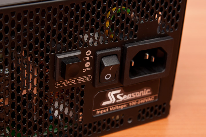 На задней панели помимо сетевого выключателя присутствует кнопка активации гибридного режима системы охлаждения, которая позволяет вентилятору бездействовать при неполной нагрузке. Учитывая КПД блоков, вполне реальна пассивная работа во время серфинга в сети Интернет или даже жарких баталий в играх. Так ли это мы проверим чуть позже, во время тестирования.