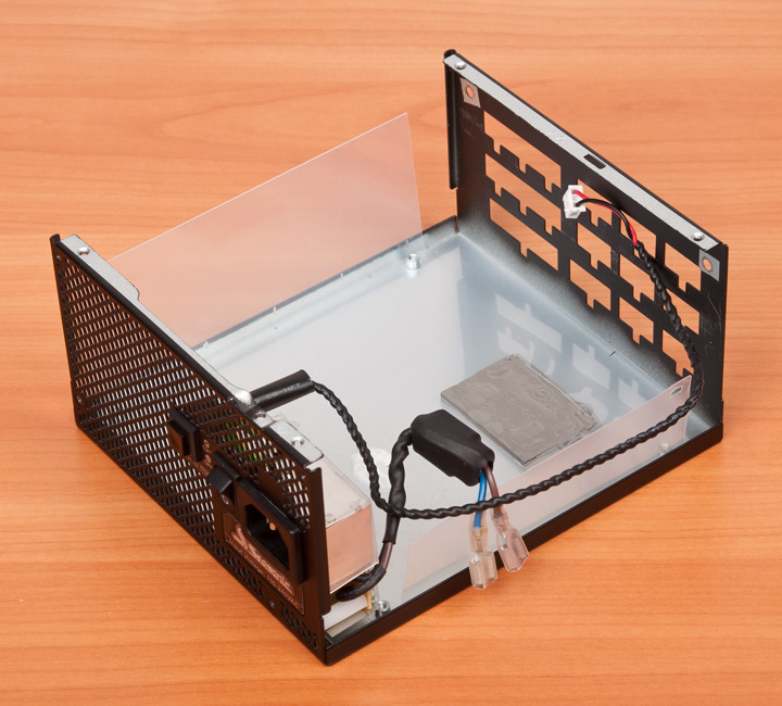 Так же часть тепла от транзисторов через толстую термопрокладку уходит на корпус блока питания. И, забегая наперед, отмечу, что во время сильной нагрузки эта стенка таки прилично греется, не обжигает, но остается довольно-таки горячей.