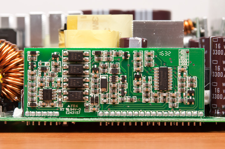 Схемотехника блоков питания построена на базе контроллера Champion CM6901T6, расположенного на отдельной плате. Рядом с ней находится еще одна платка, на которой размещен блок управления и разъемы вентилятора и гибридной системы охлаждения.