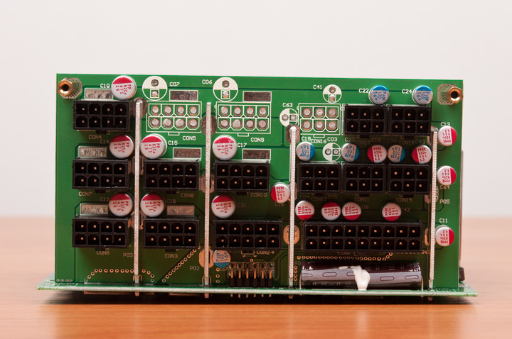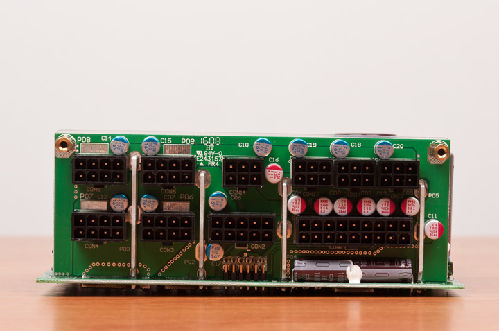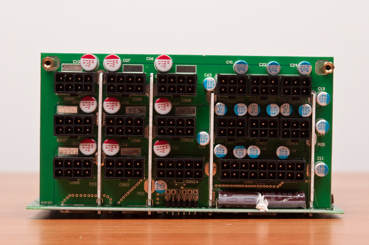 Кроме того, большое количество полимерных емкостей и пара обычных используется на платах с разъемами для подключения кабелей. Сами платы подсоединены к основной PCB мощными шинами.