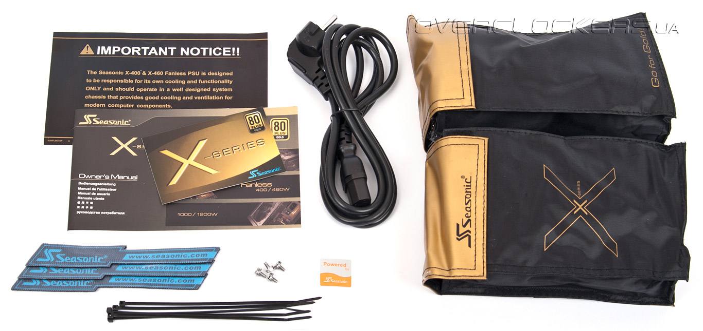 Комплект поставки стандартен для этой серии: крепежные винтики, стяжки, инструкция, наклейка на корпус с логотипом Seasonic, силовой кабель и двойной чехол с кабелями. Велюровый чехол для блока тоже присутствует.