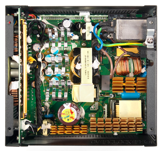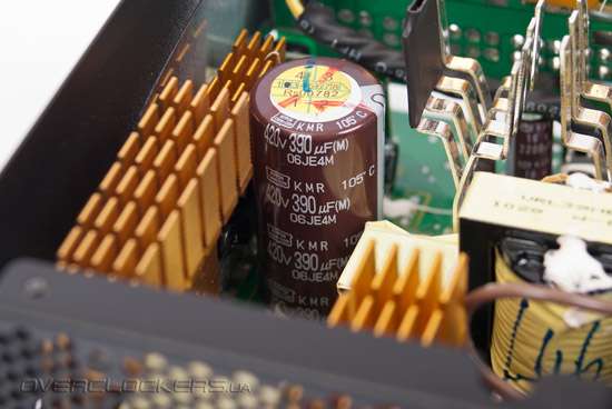 В блоке сглаживания входного напряжения установлена одна емкость на 390 мкФ и 420 вольт. Все конденсаторы в SS-460FL, как и в младшей модели, рассчитаны на рабочую температуру до 105 °C. Кроме того, входной фильтр, как всегда, выполнен с использованием всех необходимых компонентов, включая варистор, ограничивающий броски напряжения.
