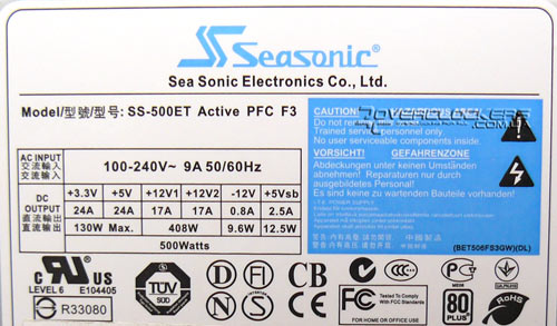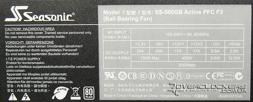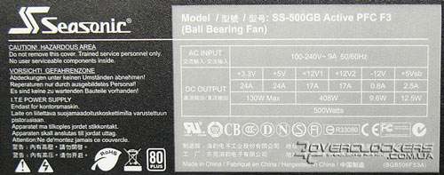 По характеристикам SS-500GB не сильно отличается от блоков питания мощностью 500 Вт от других производителей: максимальная нагрузка на каналы +3,3V и +5V возможна на уровне 130 Вт, канал +12V разбит на две виртуальные линии с ограничением по 17 А на каждую.