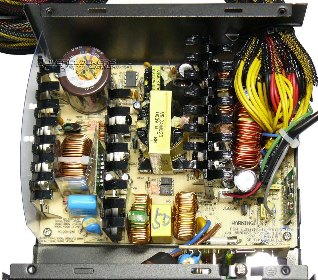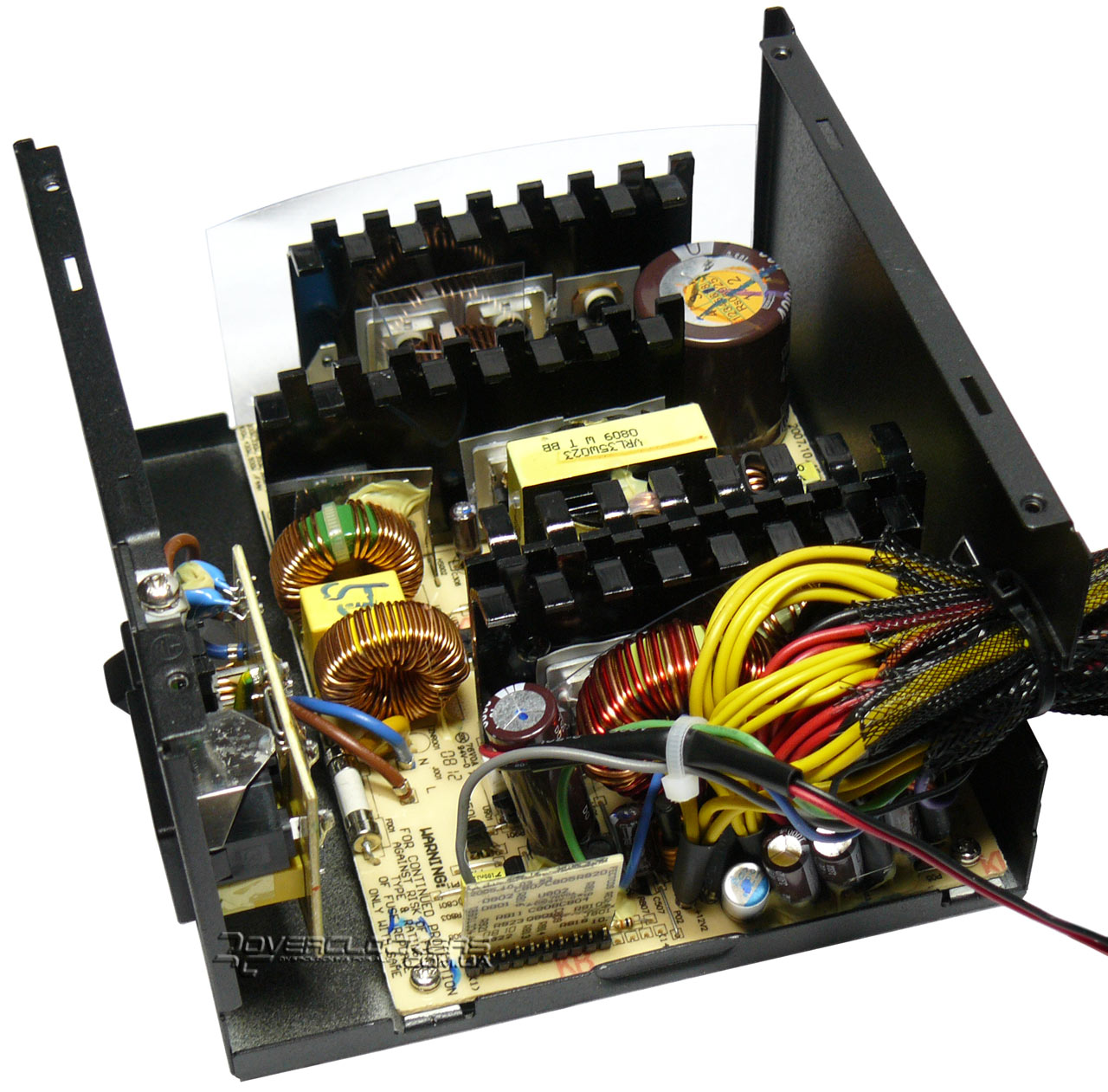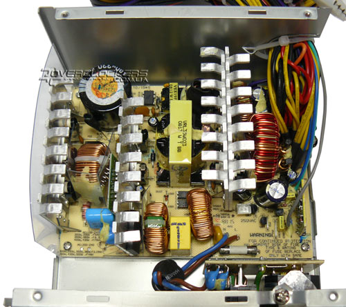 Схемотехника обеих моделей идентична, за исключением окрашенных в черный цвет радиаторов в SS-500GB и наличия одного полимерного конденсатора в цепи фильтрации линии +12V. На входе стоит один конденсатор емкостью 330 мкФ и рассчитанный на 400 В. Тут же расположен радиатор с транзисторами и диодами активного PFC и радиатор для охлаждения ключевых транзисторов. Для охлаждения диодных сборок выходного выпрямителя используется радиатор, состоящий из двух половинок и соединенный несколькими заклепками — стандартное решение для Seasonic.