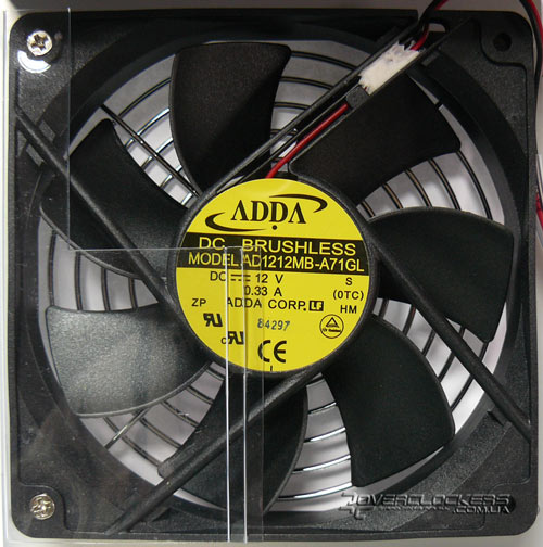 Для охлаждения блоков установлен 120-мм вентилятор ADDA AD1212MB-A71GL с номинальной скоростью вращения 2050 об/мин, часть которого накрыта прозрачной крышкой для формирования правильного потока воздуха.
