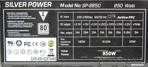 Всего линий +12V у рассматриваемого БП четыре, по 20 А каждая, но они не раздельные, а виртуальные, т.е. стоят ограничительные шунты на канал. Общая мощность нагрузки по 12 В может составлять 816 Вт, комбинированная по линиям +3,3V и +5V — 180 Вт. Кстати, по низковольтным линиям также стоят о граничивающие шунты. Модель SP-S850, как и полагает современным БП, оснащена активным PFC и рассчитана на сетевое напряжение в переделах 100-240 В. Соответствие стандарту 80 Plus позволяет Silver Power SP-S850 демонстрировать высокий КПД — не менее 80%.