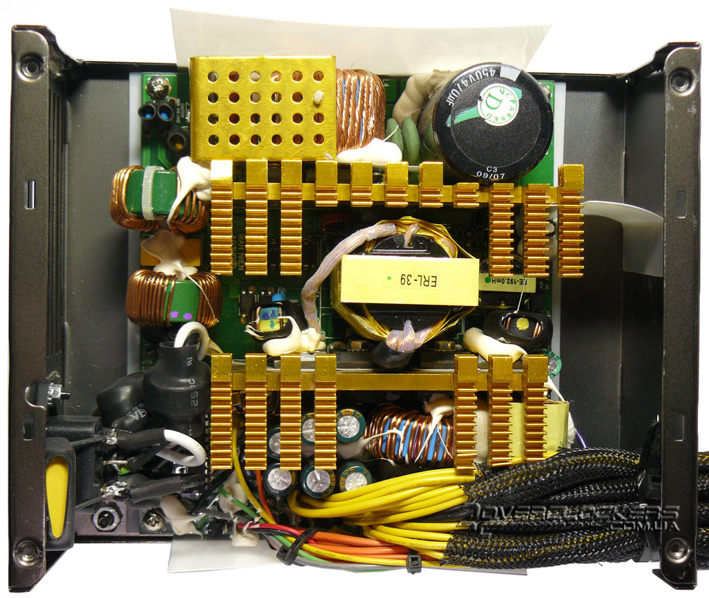 Модель Silver Power SP-S850 выполнена по OEM-соглашению с Solytech Enterprise Corporation, которая также производит блоки питания для компаний Apex и MSI. Неплохое качество сборки, наличие всех элементов на плате — все соответствует уровню изделия. Во входной цепи установлен один высоковольтный конденсатор емкостью 470 мкФ и рассчитанный на 450 В. Для охлаждения силовых элементов используются алюминиевые радиаторы сложной формы желтого цвета.