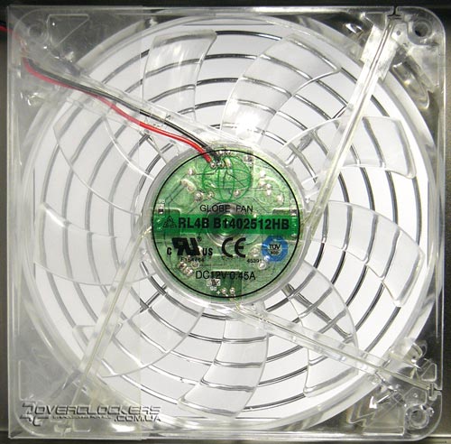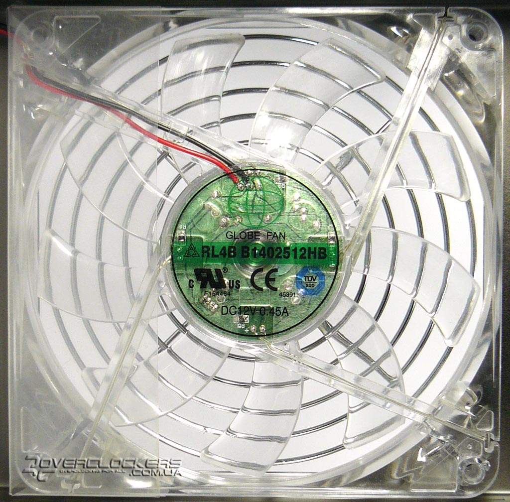 В качестве вентилятора используется 140-мм модель B1402512HB от Globe Fan с синей подсветкой. Для направления потока воздуха на радиаторы часть вентилятора прикрыта прозрачной пластинкой. Аналогичным образом сделано и у Seasonic M12D-850.