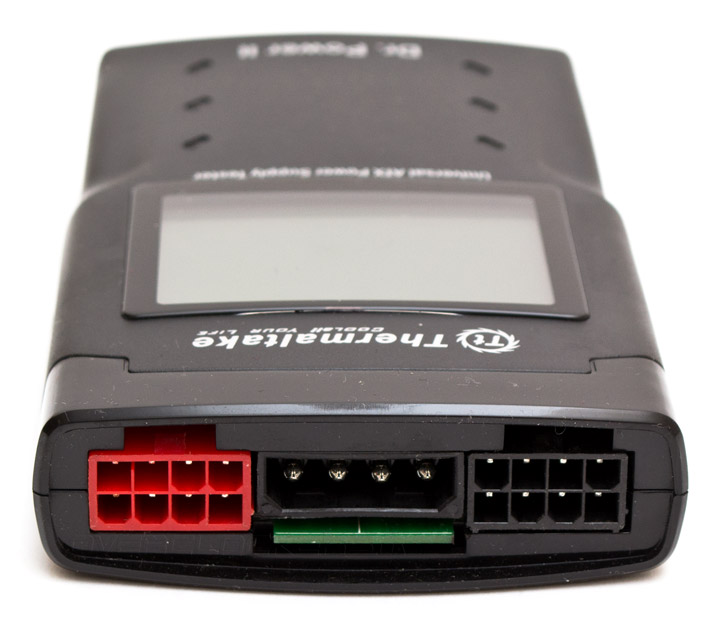 На верхней грани есть красный 8-контактный разъем питания PCI-E, разъем Molex, SATA-power и 8-контактный разъем для провода питания процессора. Подключение данных коннекторов является опциональным (в зависимости от того, какое именно напряжение требуется проверить) — прибор будет работать и без них.