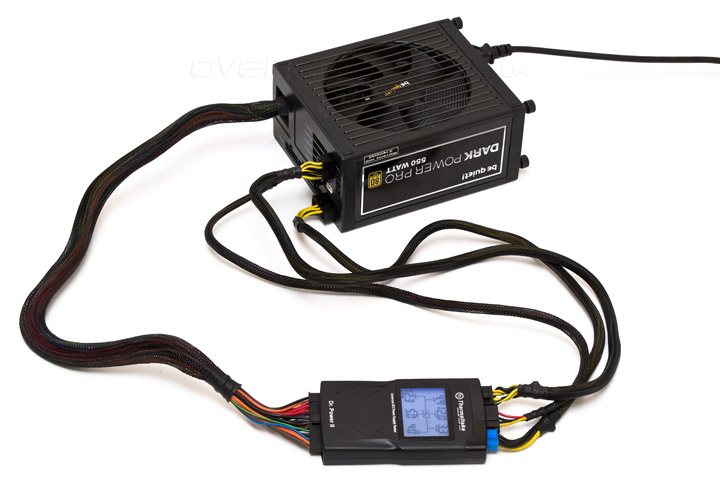 Проверку функциональности Thermaltake Dr.Power II мы провели с помощью стендового блока питания — be quiet! Dark Power Pro 10 (550 Вт), имеющего сертификат 80 Plus Gold. Следуя указаниям инструкции, сначала были подключены все необходимые разъемы, и лишь потом нажата клавиша включения питания на БП.