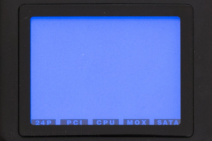Для начала тестирования следует нажать единственную кнопку на приборе. Причем сделать это можно двумя способами. Вариант А — просто нажать. Тогда для перехода к каждому следующему этапу теста, кнопку нужно будет нажимать снова и снова. Вариант Б — зажать клавишу на пять секунд. В этом случае прибор будет проводить тестирование в автоматическом режиме, переходя к следующему этапу в течение пяти секунд. Если в какой-то части теста измерения выйдут за рамки нормы, прибор остановится на этом этапе, сменит цвет экрана на красный и включит звуковое оповещение. Порядок тестирования разъемов — 24-pin, PCI-E, CPU, Molex, SATA. Если какой-то из разъемов не подключен, данный этап пропускается. На текущей картинке мы видим состояние основных линий 24-контактного кабеля: +5 В, +12 В, +3,3 В, –12 В, дежурной линии +5В и P.G. Все находится в пределах нормы. Для тех читателей, кто не в курсе, что такое сигнал P.G. (Power Good), отметим, что это способ самодиагностики блока питания, а точнее — время перехода всех линий питания в рабочее состояние, измеряемое в миллисекундах. Если все в порядке, значение должно находиться в пределах от 100 до 500 мс. Если значение за пределами нормы, процессор обычно подает команду на отключение блока питания.