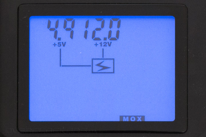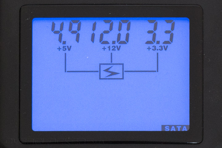 И наконец — разъем питания, который обычно используется для современных накопителей. Здесь есть три тестируемых напряжения +5 В, +12 В и +3,3 В. Тоже видно незначительное отклонение вниз по первому значению. При нажатии кнопки после этого этапа, тестер вернулся к начальному экрану, где отображался перечень подключенных разъемов. С точки зрения прибора Thermaltake Dr.Power II с нашим блоком питания все в порядке и он может быть допущен к дальнейшим испытаниям нового компьютерного железа.
