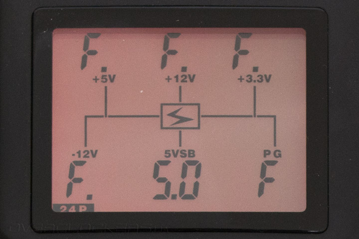 Чтобы воочию увидеть, как выглядит экран предупреждения об ошибке в данном устройстве, мы попытались запустить его на остаточном напряжении блока питания, не подключенного к сети. И вот что получили: буквы F (значение находится вне предела измеряемых значений) по всем параметрам, кроме дежурной линии питания.