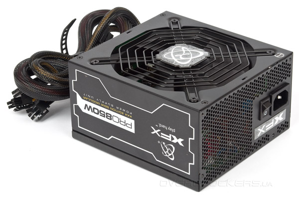 Что касается внешнего вида, то блок P1-850X-XXB9 (по правде говоря, на этикетке указана модель XPS-850W-3XB) обладает глубиной 160 мм и выполнен очень качественно. Корпус в отличие от дешевых устройств изготовлен из толстой стали, черное покрытие не маркое и вполне стойкое к незначительным физическим воздействиям. Проволочная решетка шестигранной формы с логотипом компании по центру защищает 135-мм вентилятор. На внешней стенке присутствуют лишь силовой разъем и небольшой выключатель, а также еще один логотип XFX.