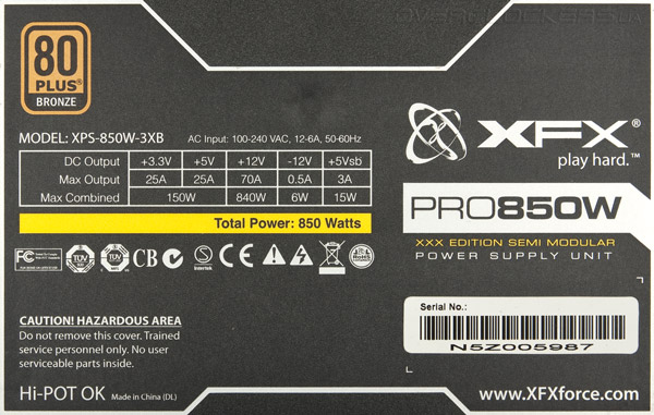 К характеристикам XFX Pro850W XXX Edition также никаких претензий, все на современном уровне. Единственная 12-вольтовая линия рассчитана на нагрузку 70 А, что почти соответствует номиналу устройства, комбинированная мощность каналов на 3,3 и 5 вольт составляет 150 Вт.