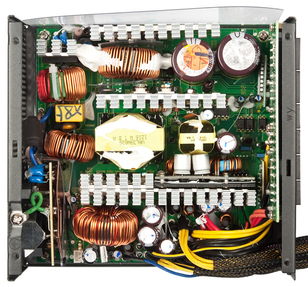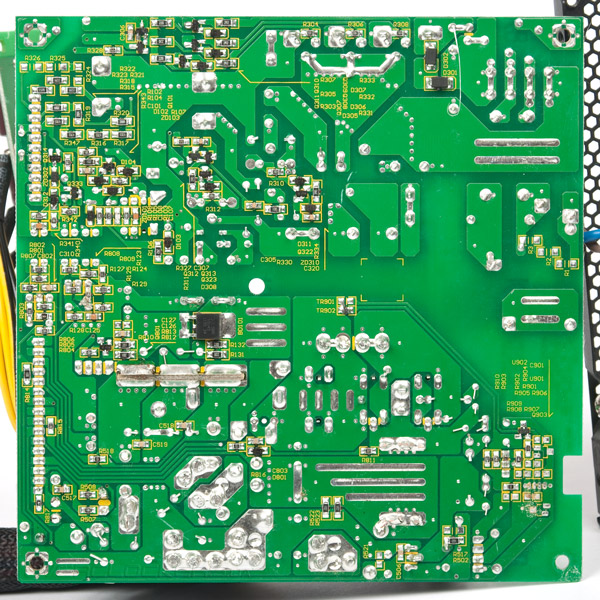 Теперь осталось взглянуть на внутреннее устройство блока питания. Как и рассмотренный ранее XPS-850W-BES наш подопечный основан на платформе Seasonic, но уже «бронзовой» и обновленной версии. Такую же начинку можно встретить в устройствах разработчика серии M12II Bronze мощностью 650, 750 и 850 Вт.