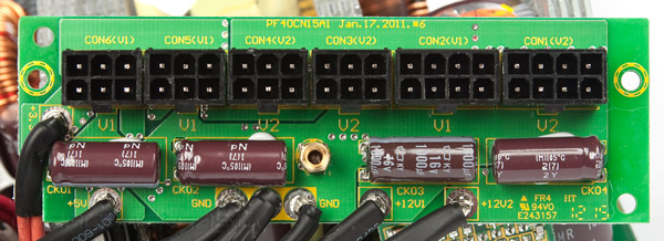 Также на отдельных платах расположены ШИМ-контроллер CM6802, отвечающий за работу двух ключевых транзисторов и активного PFC, и чип мониторинга PS223. Еще одна дополнительная плата предназначена для подключения отстегивающихся шлейфов.