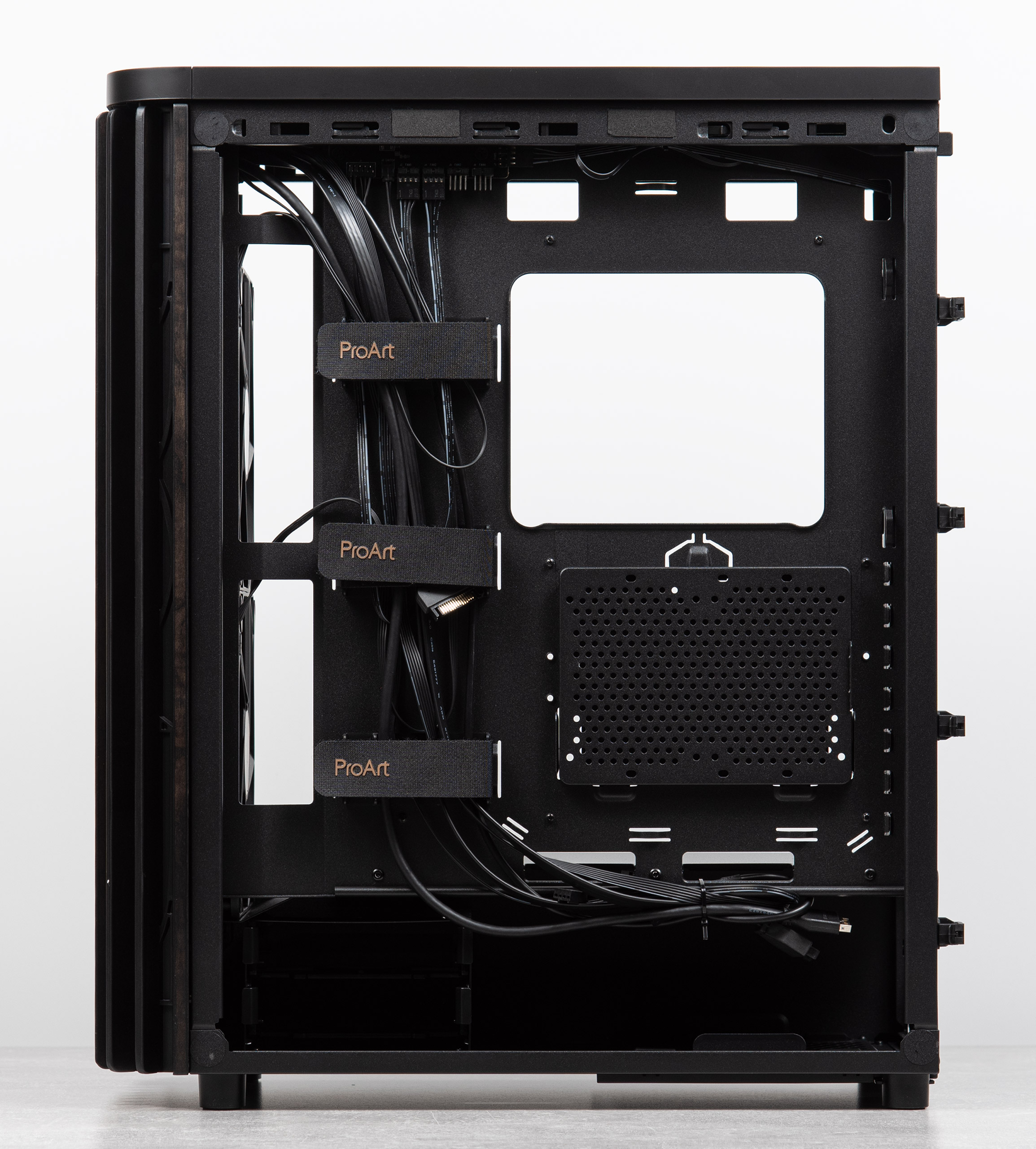 Для аккуратной прокладки кабелей за поддоном предусмотрены проушины и три широкие стяжки-липучки с надписями ProArt. Пространство в 32 мм позволит это сделать без каких-либо проблем.