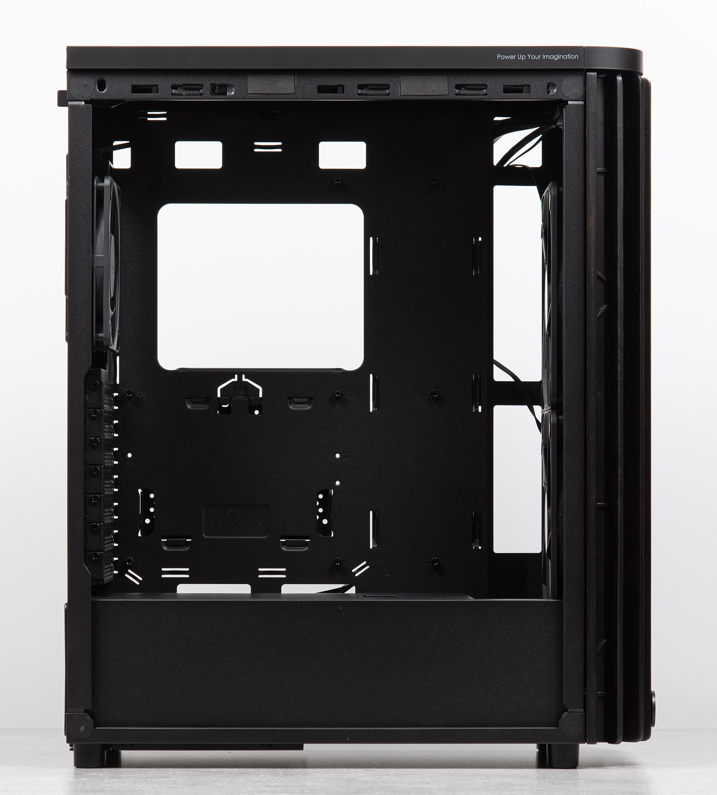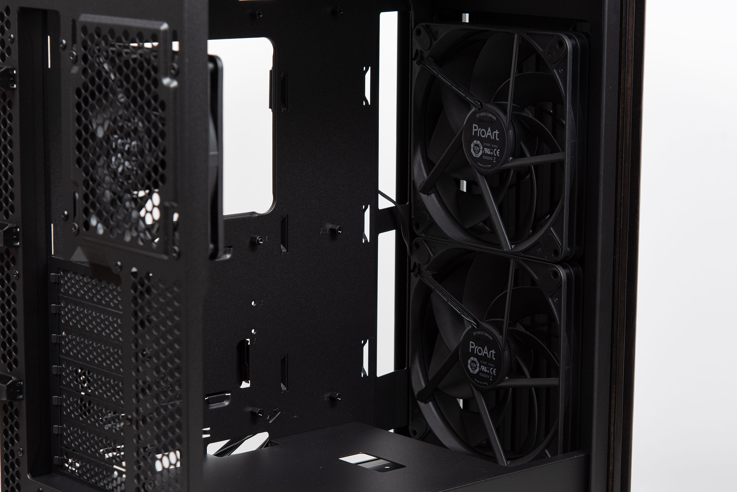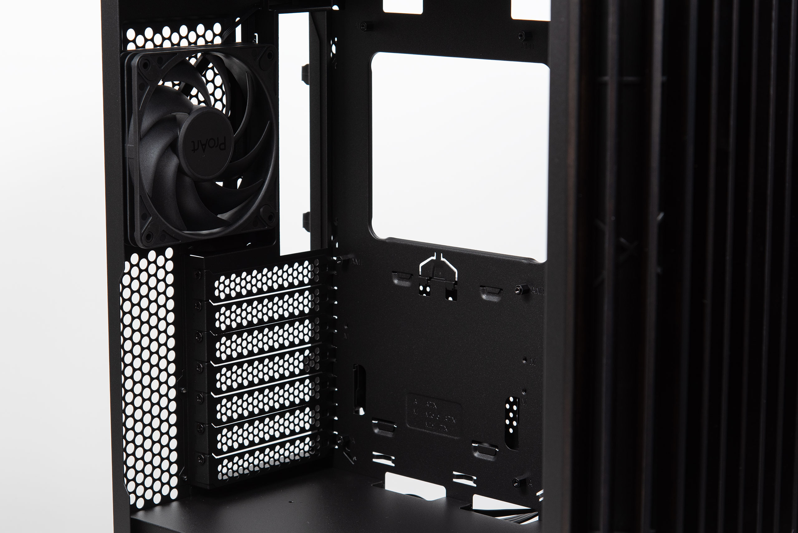 Количество поддерживаемых слотов равно семи, все они закрыты многоразовыми заглушками и в случае установки видеокарты в вертикальном положении их можно снять и заменить на соответствующую пластину-заглушку на два слота. Вентиляторы уже установлены с завода: один 120-мм (DF1202512RFLN) в задней части и два 160-мм (DF1603212RFMN) спереди, что позволяет сэкономить при сборке ПК. Для передних вентиляторов снизу предусмотрена направляющая для фокусировки воздуха в сторону основных компонентов, так что в отсек под кожухом, который накрывает блок питания, ничего от них не попадает.