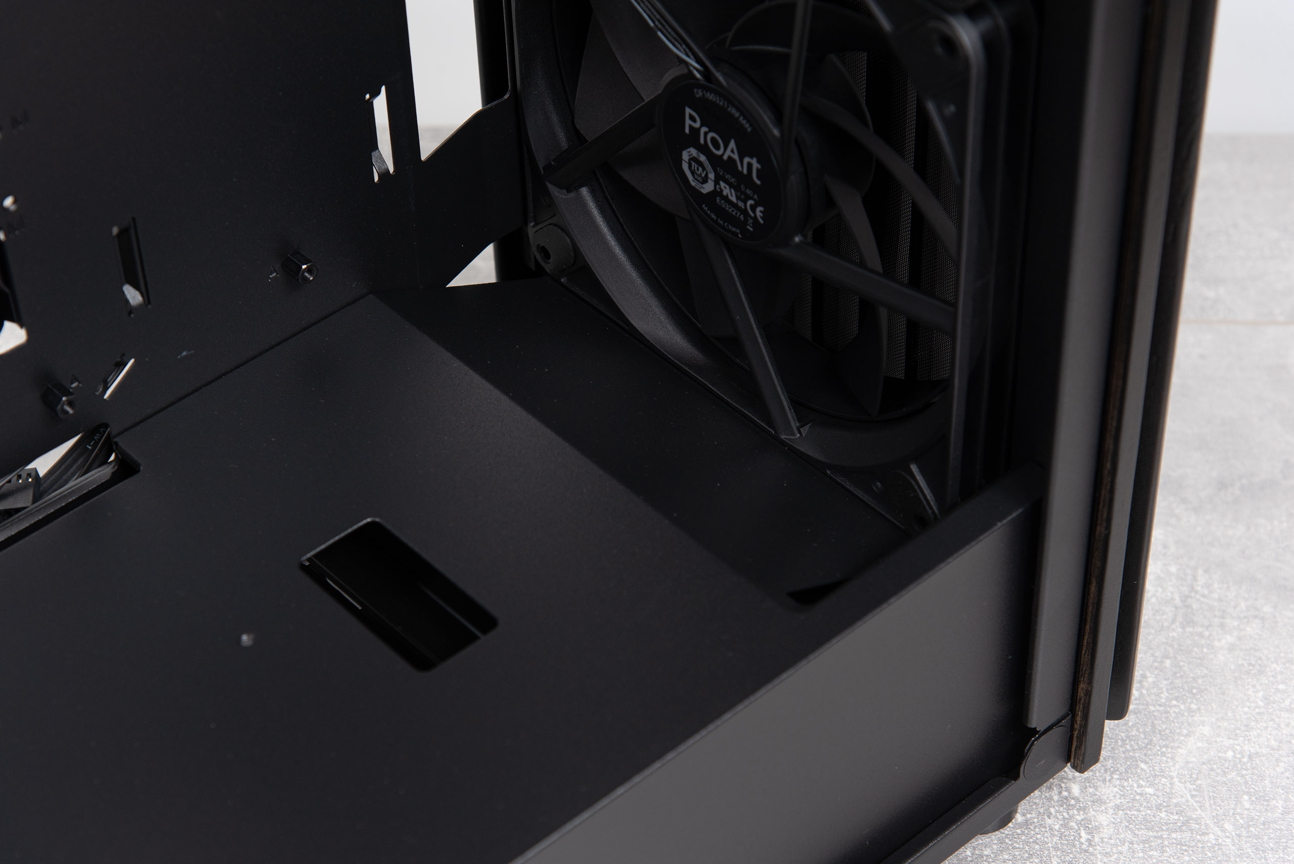 В нижней части, состоящей из сплошного кожуха и накрывающей блок питания, присутствуют отверстия для прокладки кабелей. Каких-то резиновых заглушек здесь нет, отверстия просто завальцованы для уменьшения риска протирания кабелей. Для удлинителя интерфейса PCIe, в случае установки видеокарты в вертикальное положение, предусмотрены отверстия с резьбой.