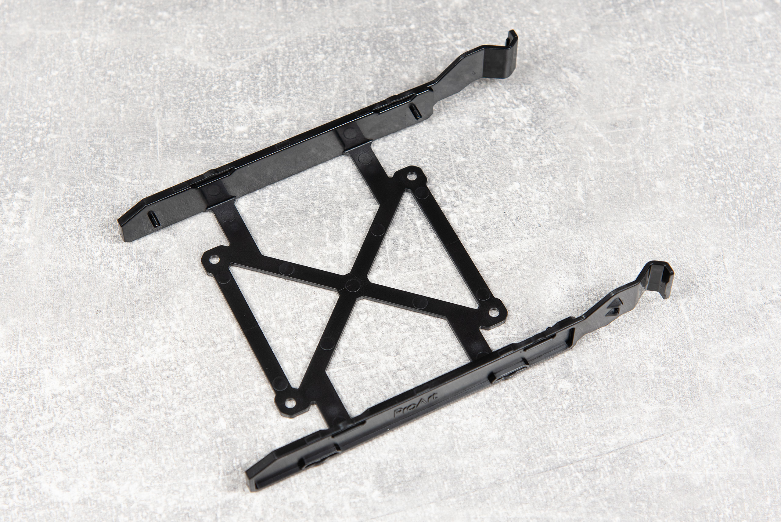 Но если снять корзину для накопителей, то размеры блока питания уже не будут ничем ограничиваться. Кстати, сама корзина позволяет установить два 3,5″ жестких диска или два 2,5″ накопителя, для чего в пластиковых лотках имеются соответствующие отверстия.