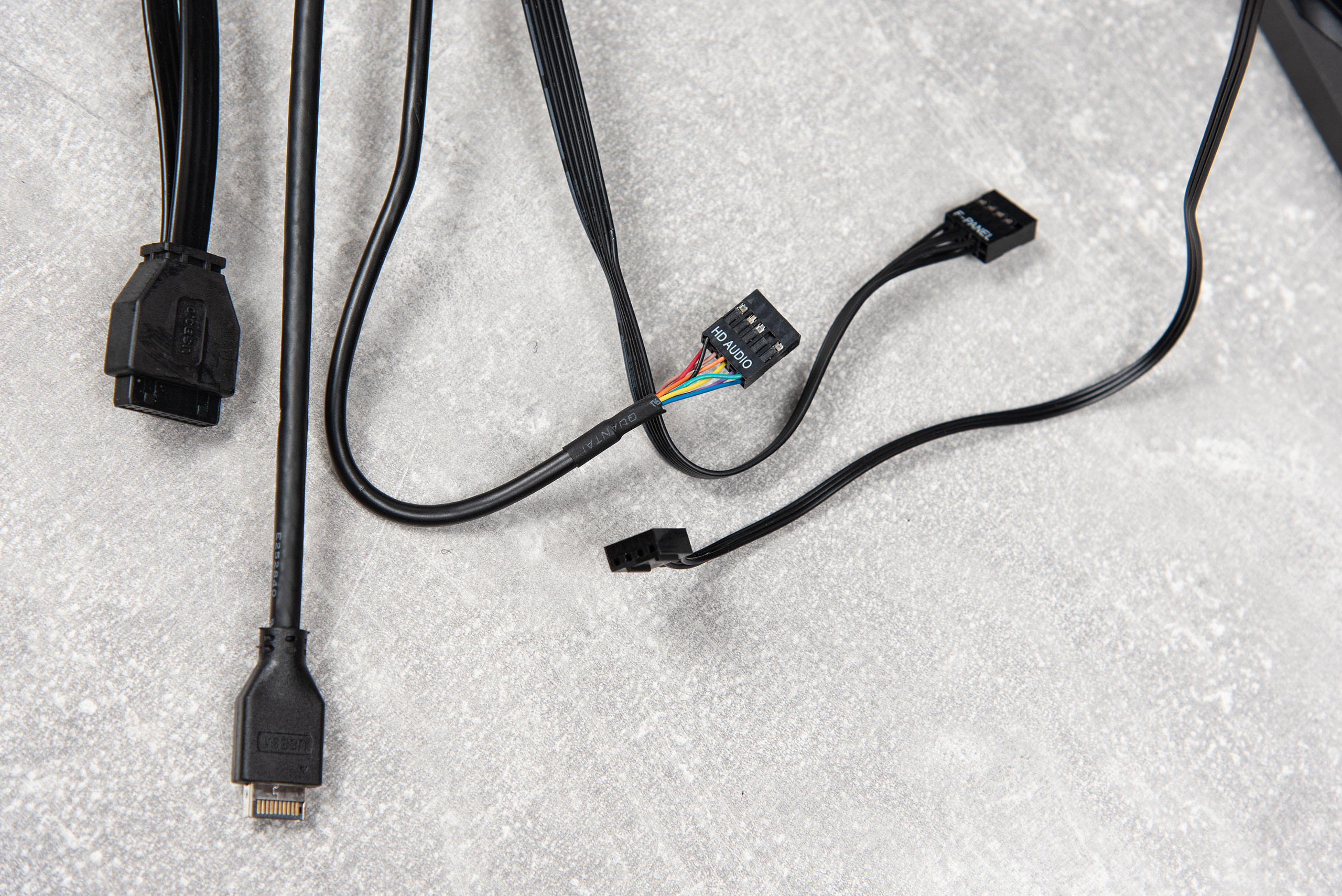 Перечень кабелей охватывает USB 3.2, USB 3.2 Type‑C, HD Audio и один на общий разъем для кнопок и индикатора передней панели, плюс еще провод от хаба с 4‑контактным коннектором. Присутствует также кабель питания Power SATA для хаба, но он настолько короткий, что при полном задействовании всех корзин для накопителей ему банально не хватит длины кабеля от блока питания.