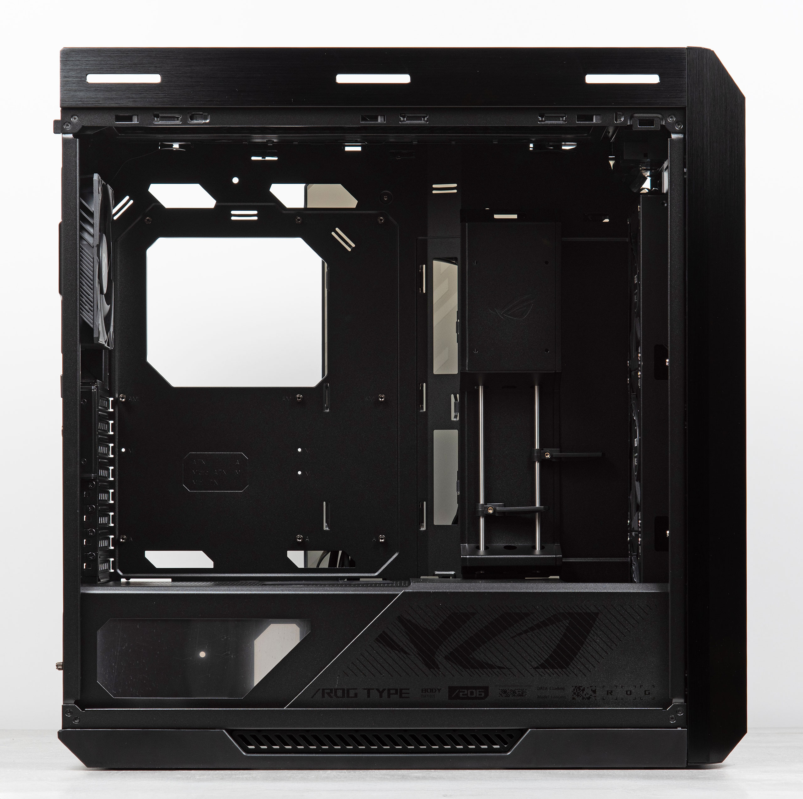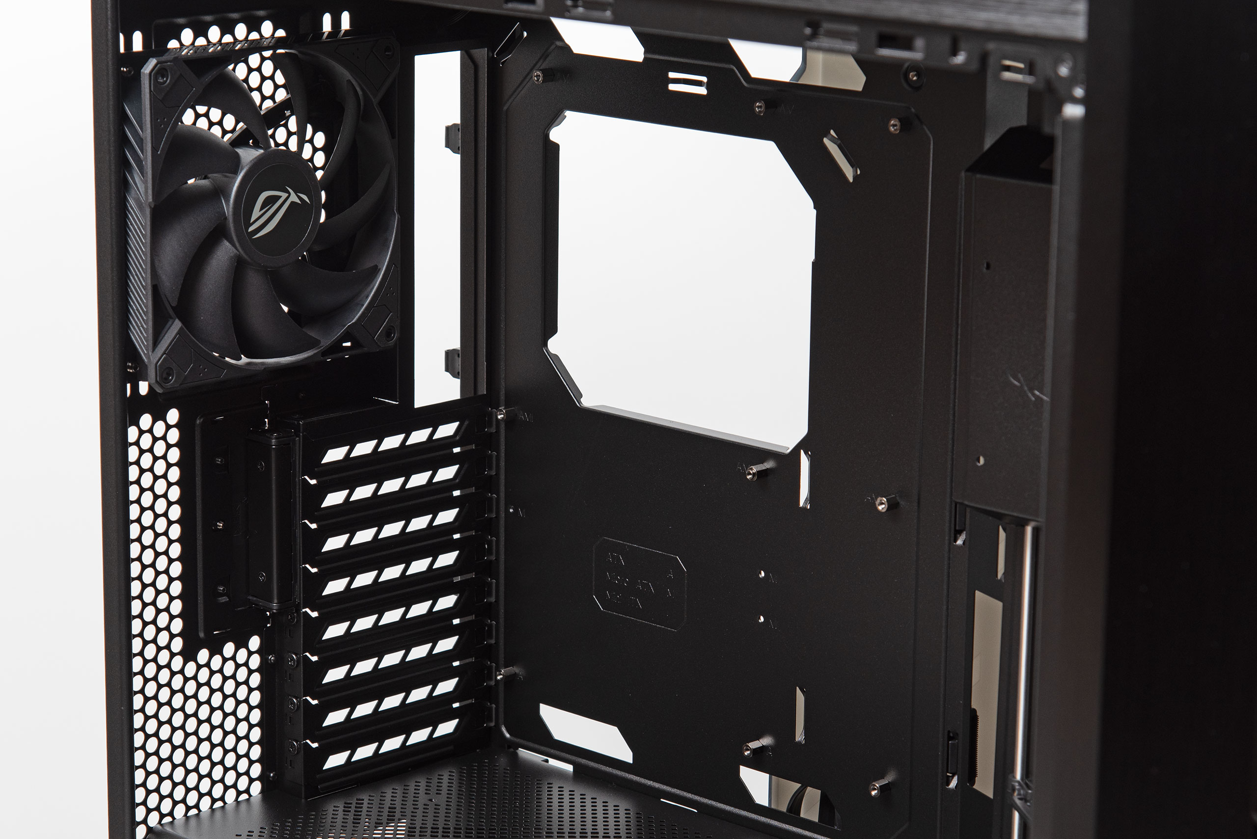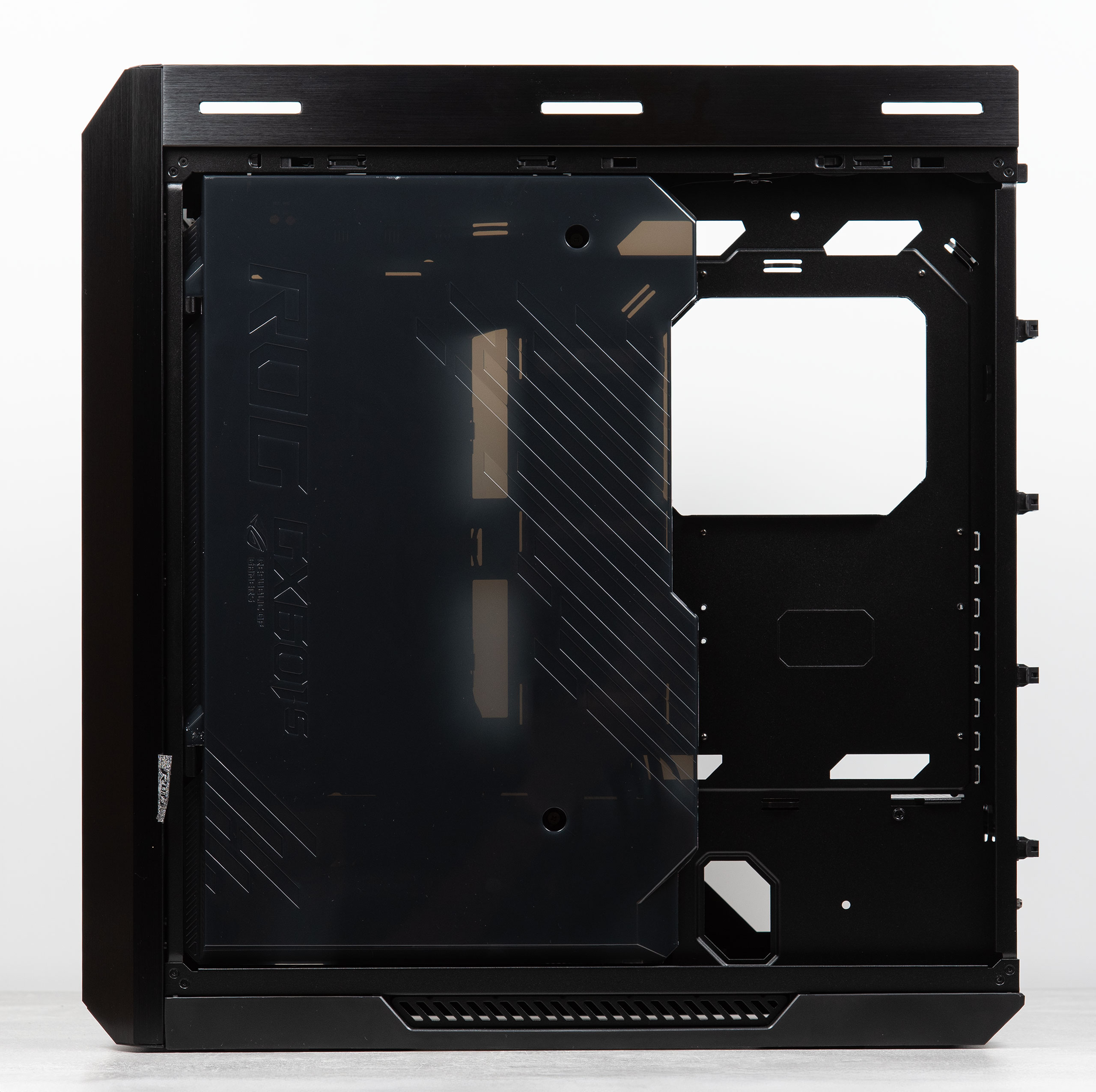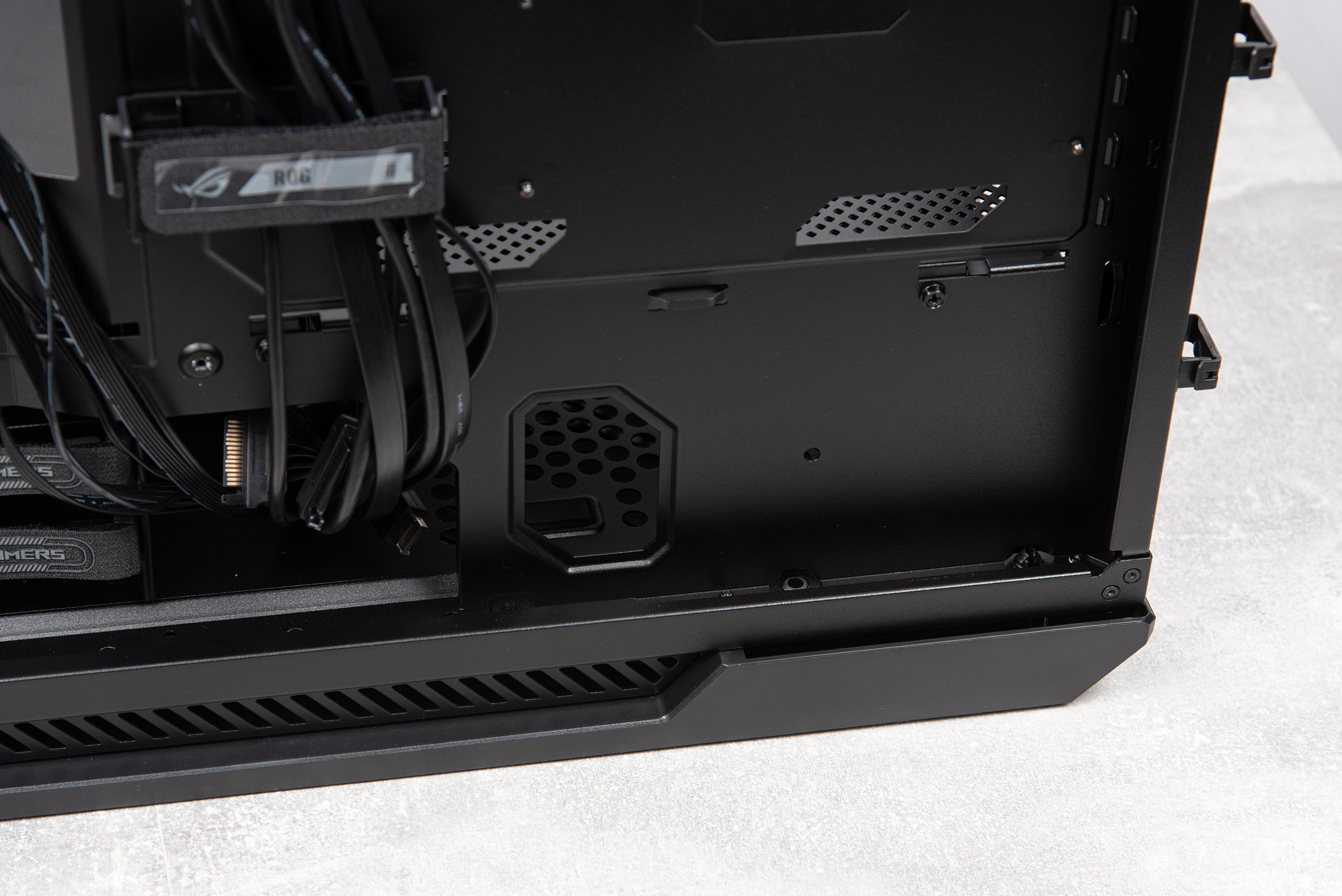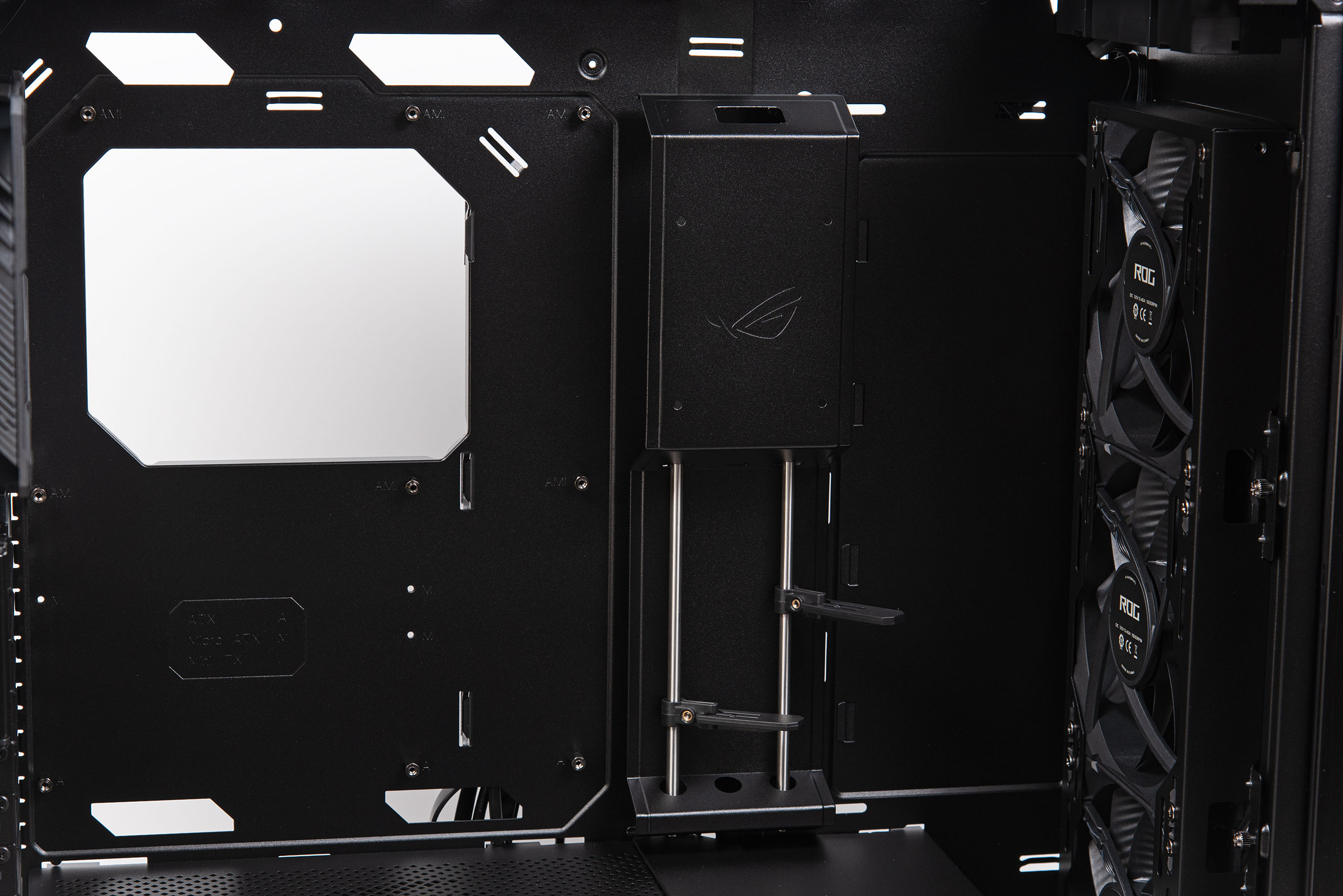 Шасси размером 591×250×565 мм позволяет установить стандартные материнские платы форм-факторов Mini-ITX, Micro-ATX, ATX и EATX. Платы с разъемами на обратной стороне не поддерживаются, хотя это странно с точки зрения того, что ASUS активно внедряет новый формат. Максимальная высота воздушного процессорного кулера может достигать 190 мм, а длина видеокарты — 450 мм, чего хватит для сборки системы из габаритных компонентов.