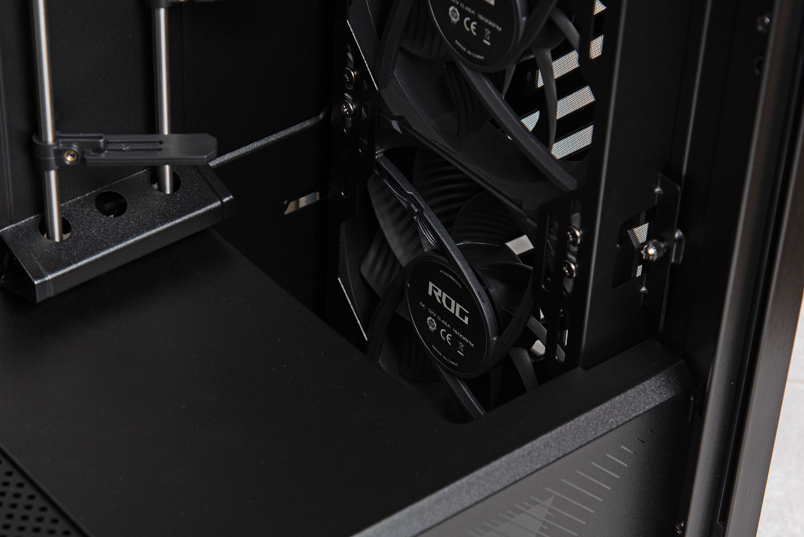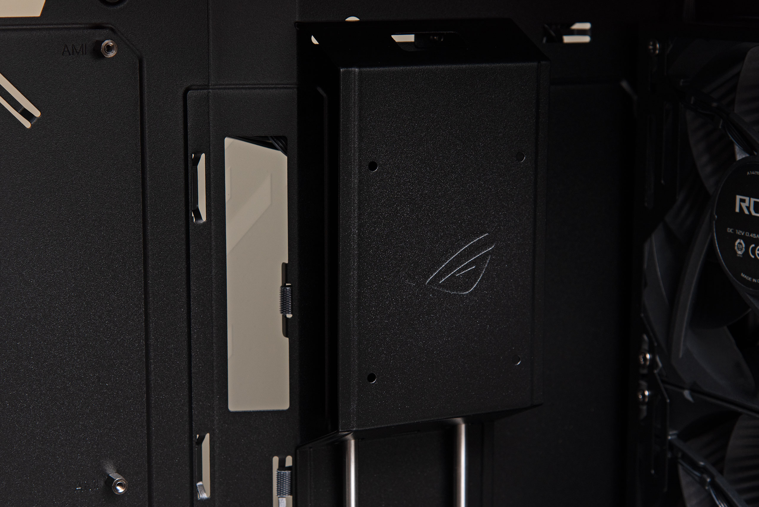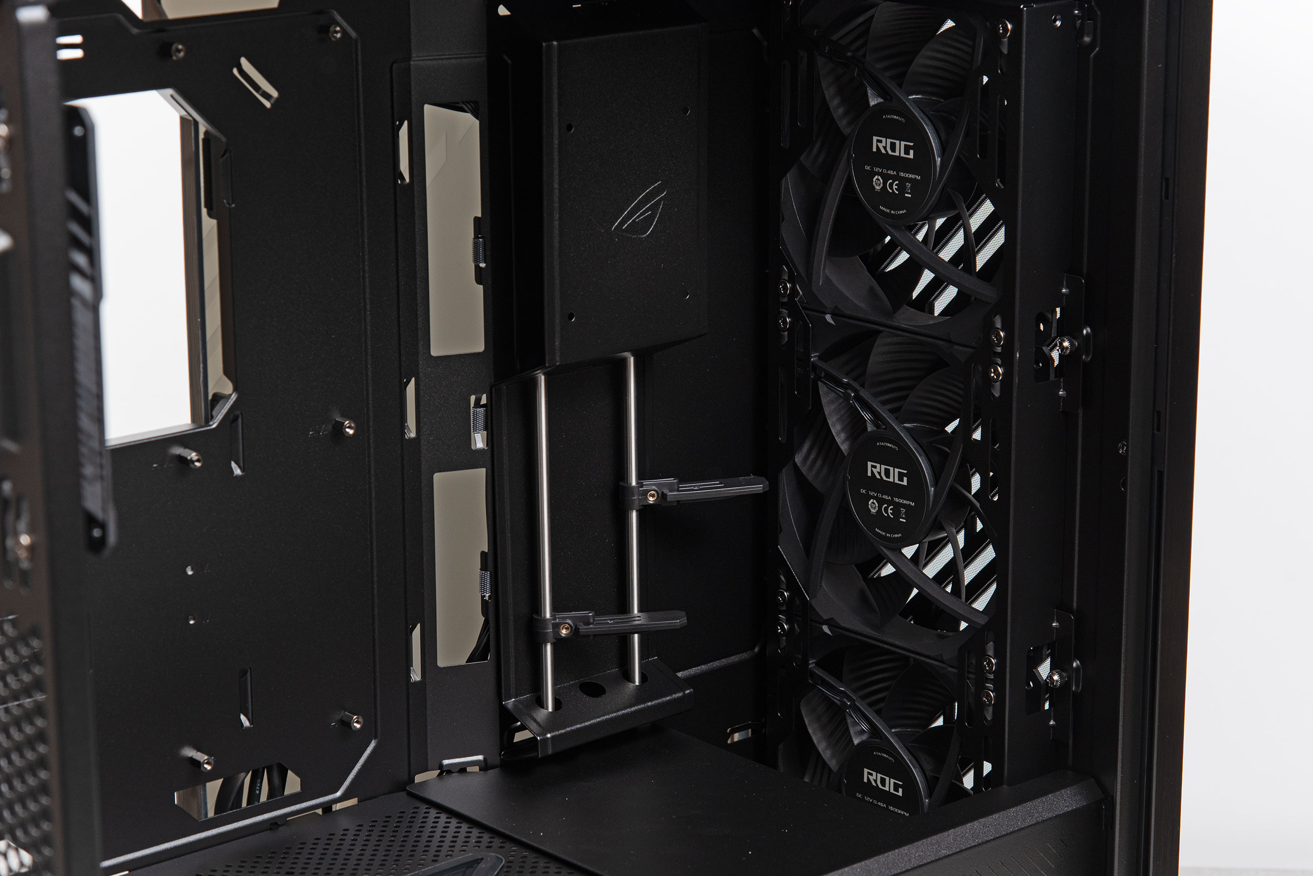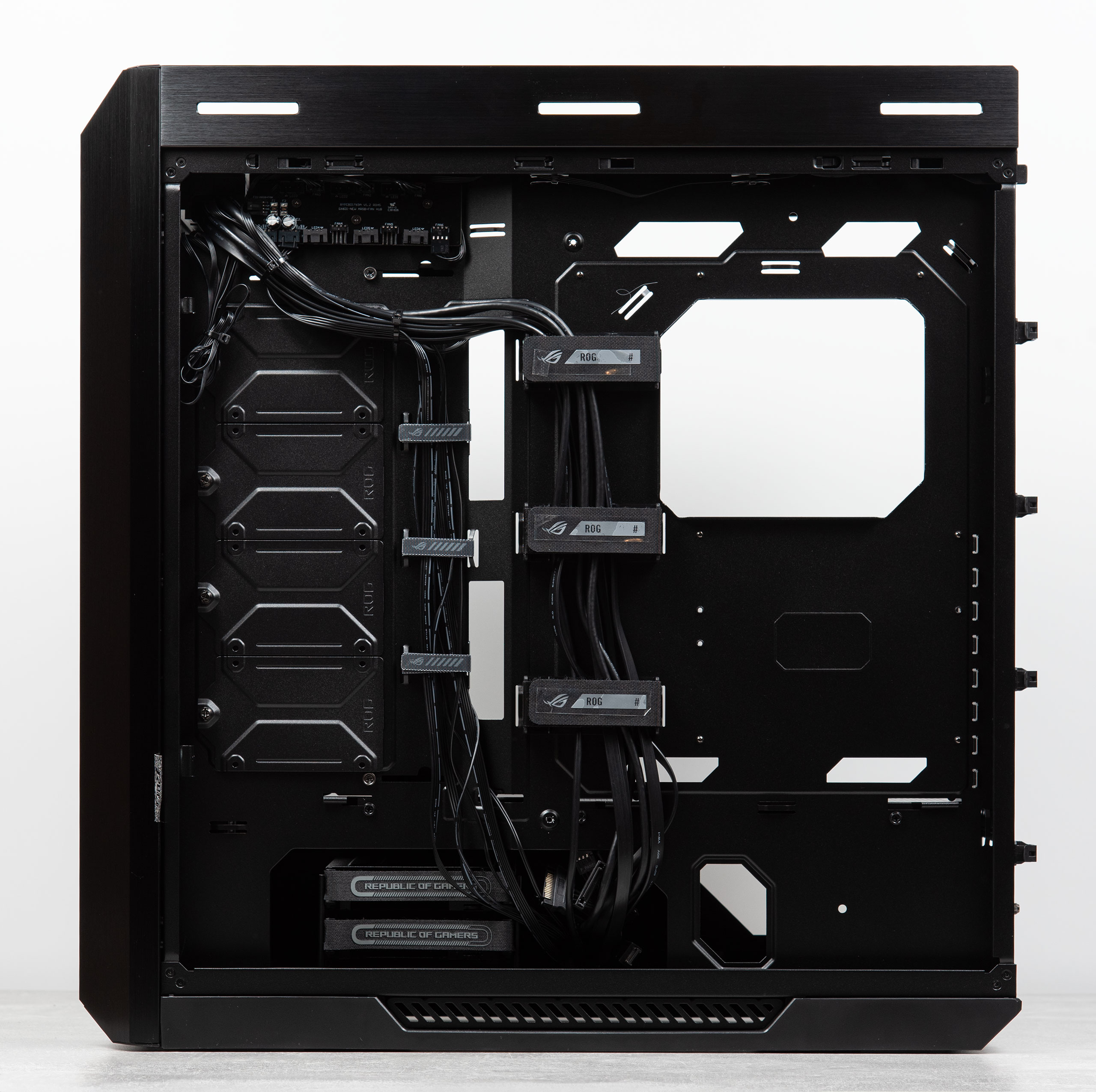 Шасси размером 591×250×565 мм позволяет установить стандартные материнские платы форм-факторов Mini-ITX, Micro-ATX, ATX и EATX. Платы с разъемами на обратной стороне не поддерживаются, хотя это странно с точки зрения того, что ASUS активно внедряет новый формат. Максимальная высота воздушного процессорного кулера может достигать 190 мм, а длина видеокарты — 450 мм, чего хватит для сборки системы из габаритных компонентов.