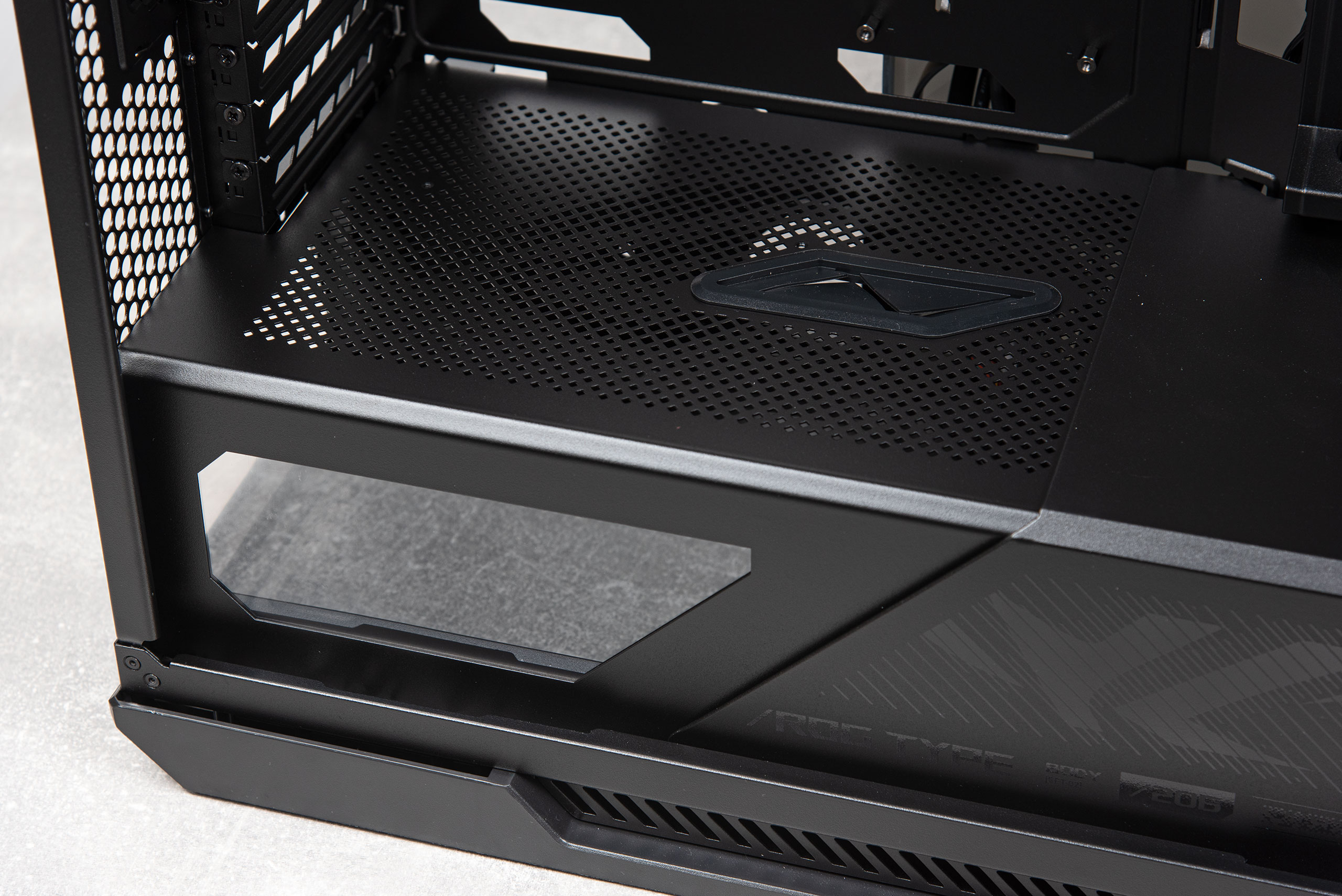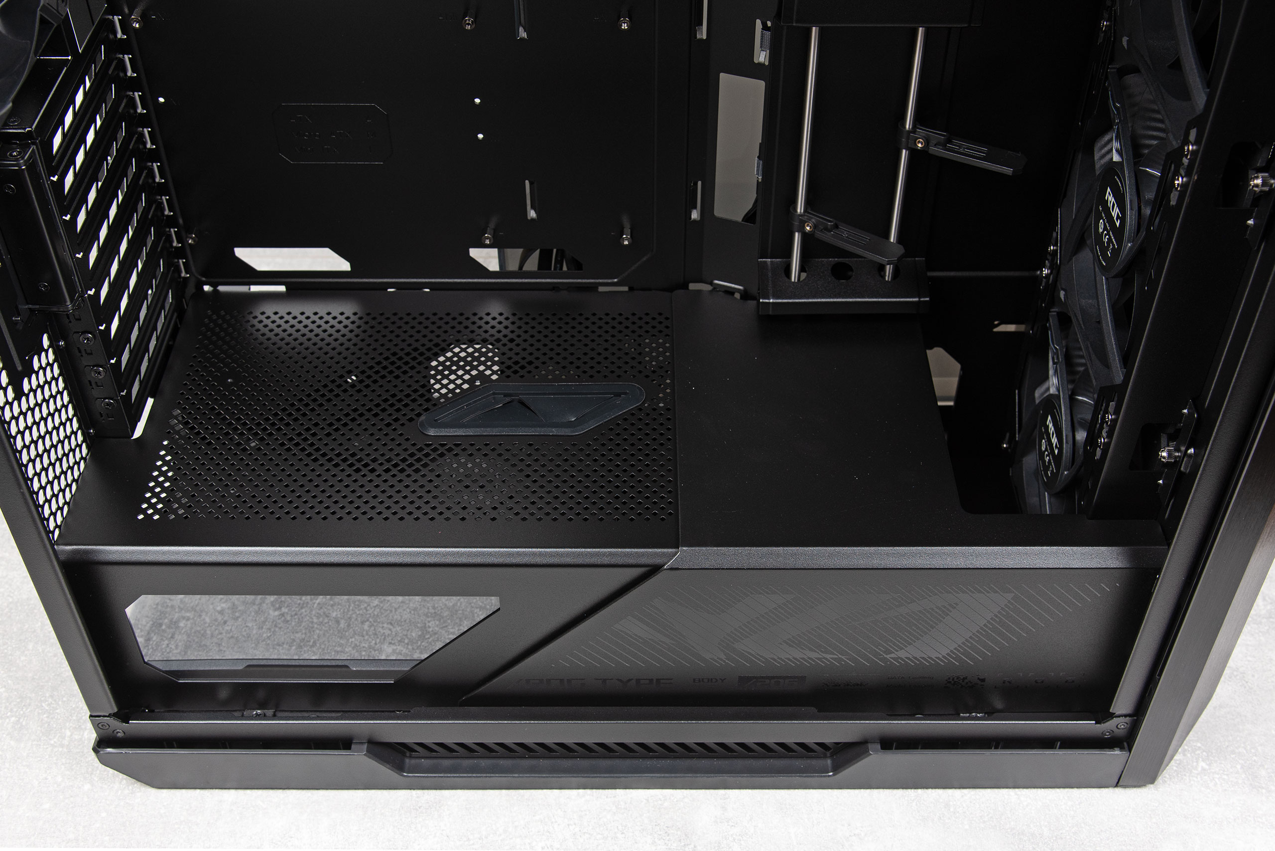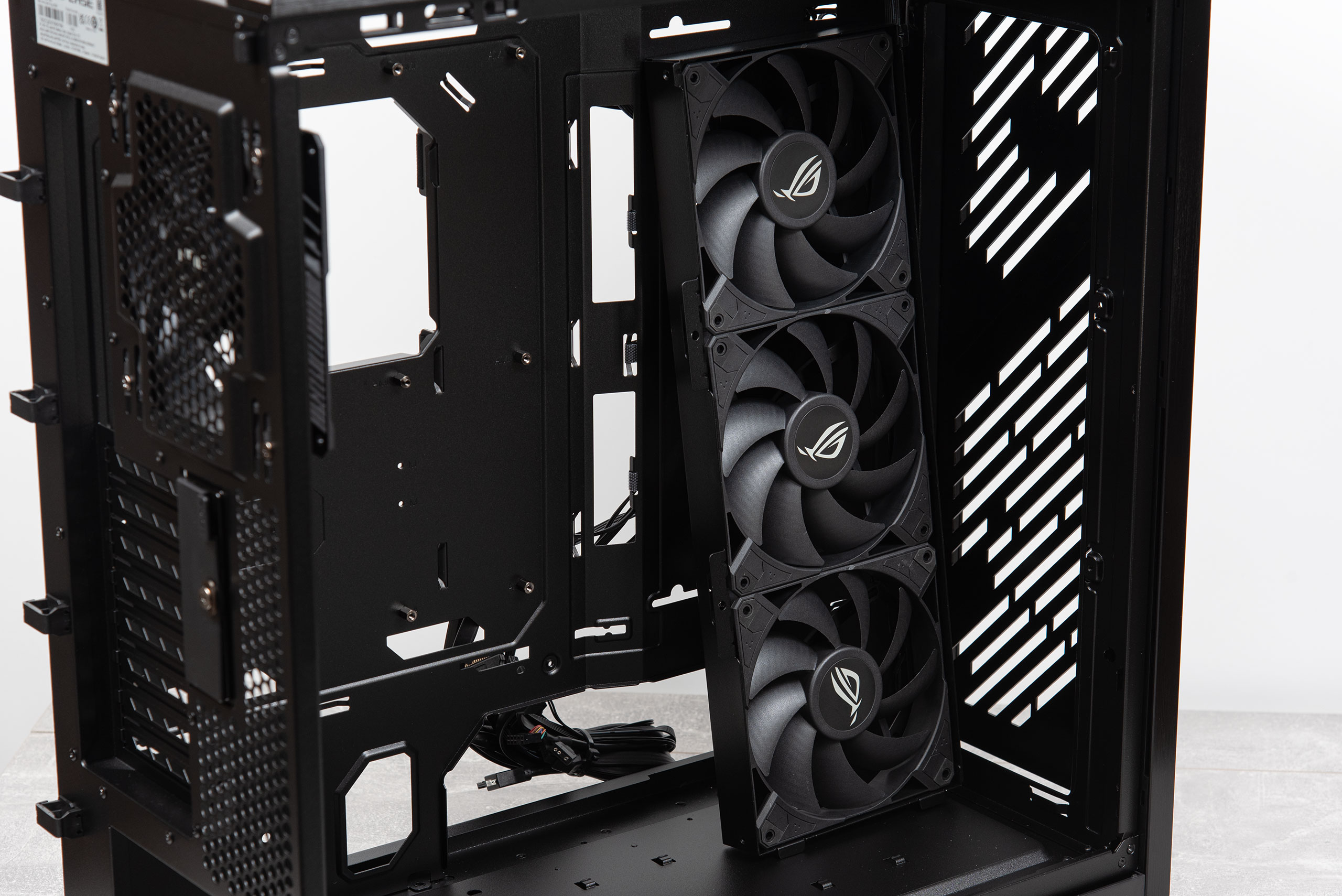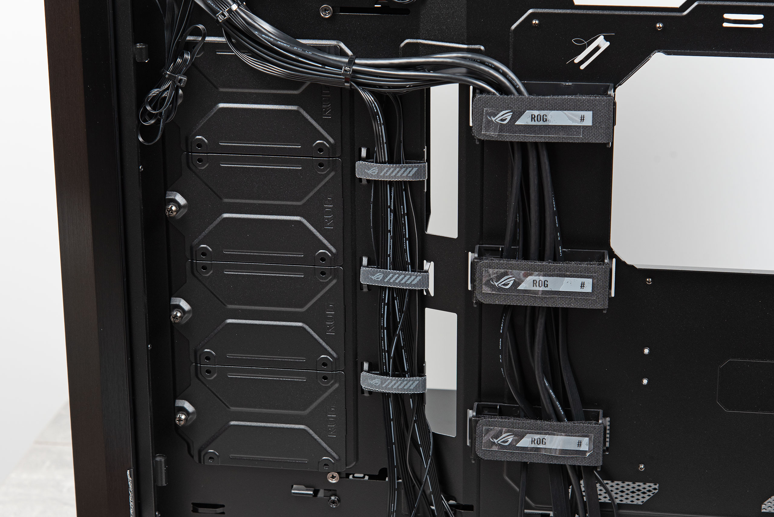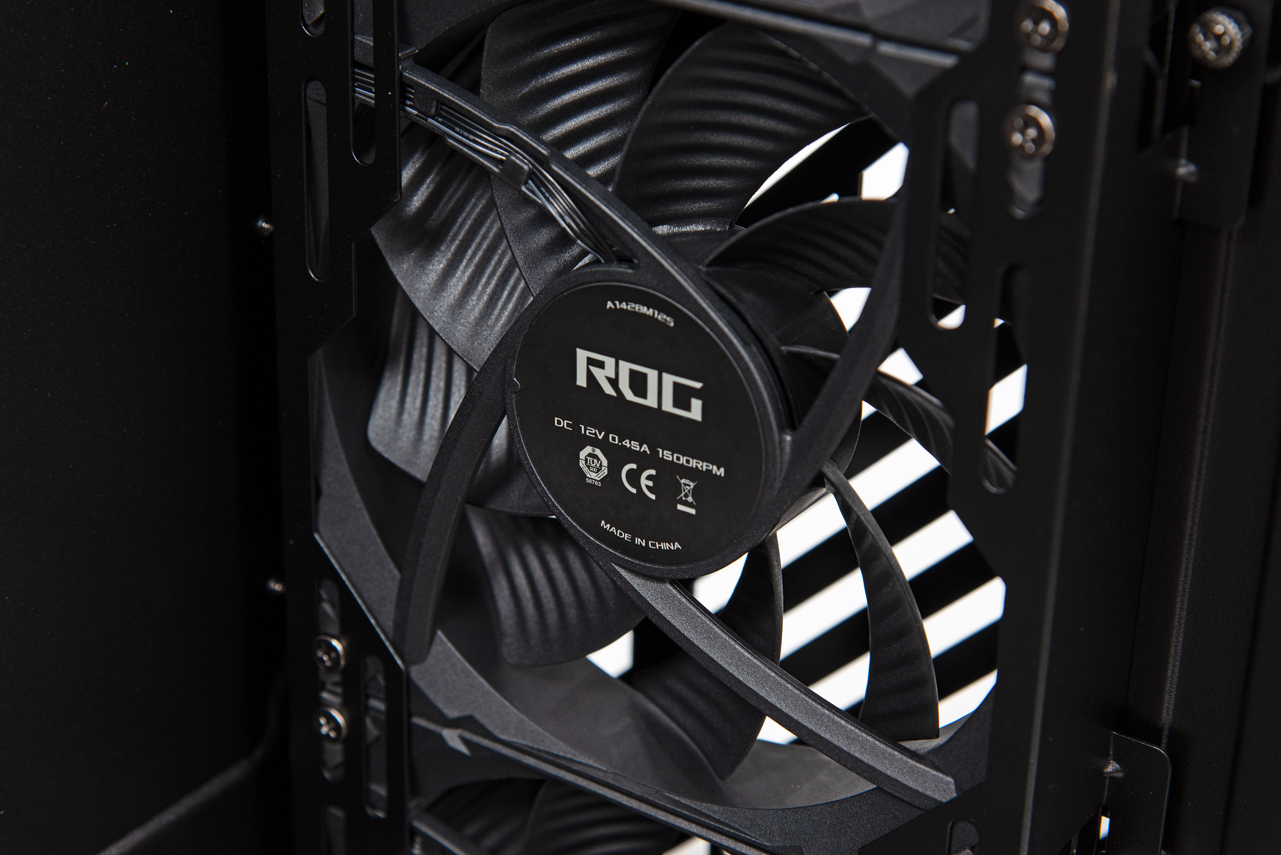 Шасси размером 591×250×565 мм позволяет установить стандартные материнские платы форм-факторов Mini-ITX, Micro-ATX, ATX и EATX. Платы с разъемами на обратной стороне не поддерживаются, хотя это странно с точки зрения того, что ASUS активно внедряет новый формат. Максимальная высота воздушного процессорного кулера может достигать 190 мм, а длина видеокарты — 450 мм, чего хватит для сборки системы из габаритных компонентов.