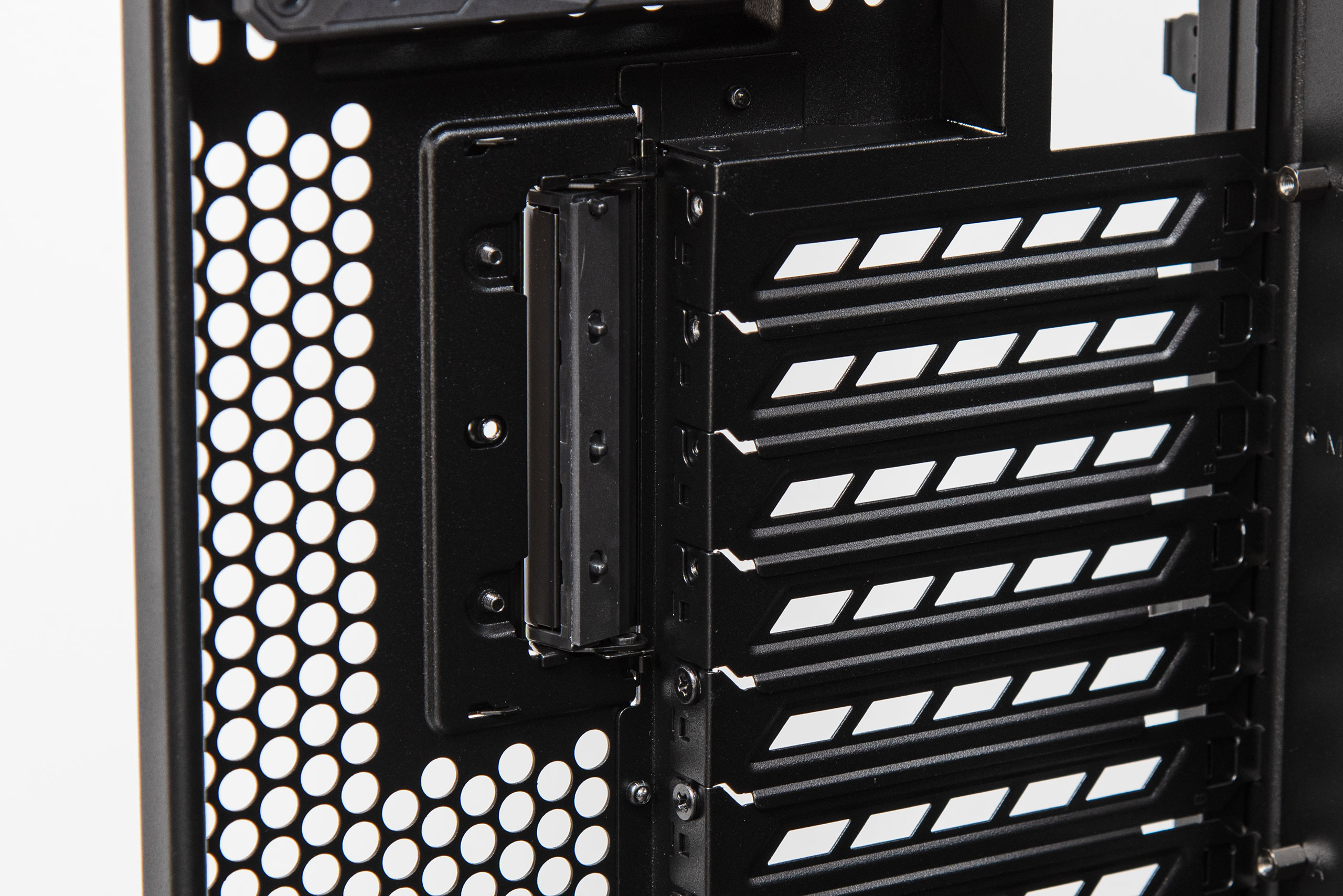 Высота шасси предусматривает восемь слотов расширения, которые закрыты многоразовыми заглушками. Четыре из них накрывает зажим для видеокарты с резиновым прижимом, все остальные зафиксированы винтами. Для вертикальной установки графического адаптера можно использовать комплектный переходник, а вот удлинитель для слота PCI Express x16 придется покупать отдельно.