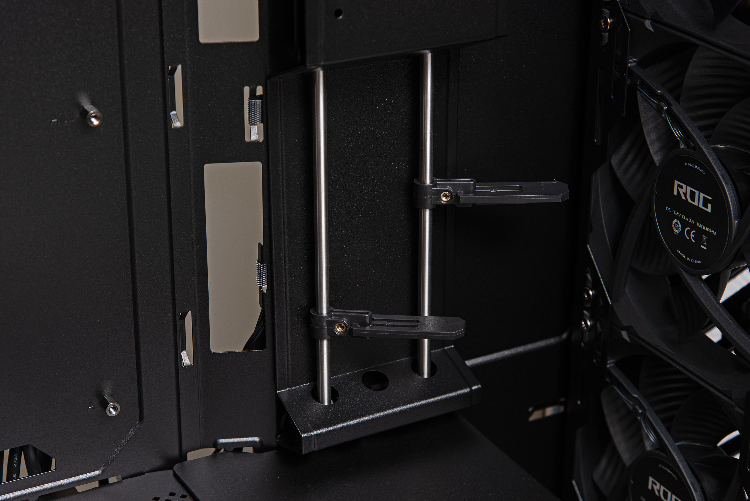 Также из прошлой версии перекочевала стойка с кожухом и подпорками для видеокарты. Высоту размещения подпорок можно менять в зависимости от графического адаптера, а стойку можно сдвинуть вперед или назад в зависимости от формата установленной материнской платы, ну или вообще снять.