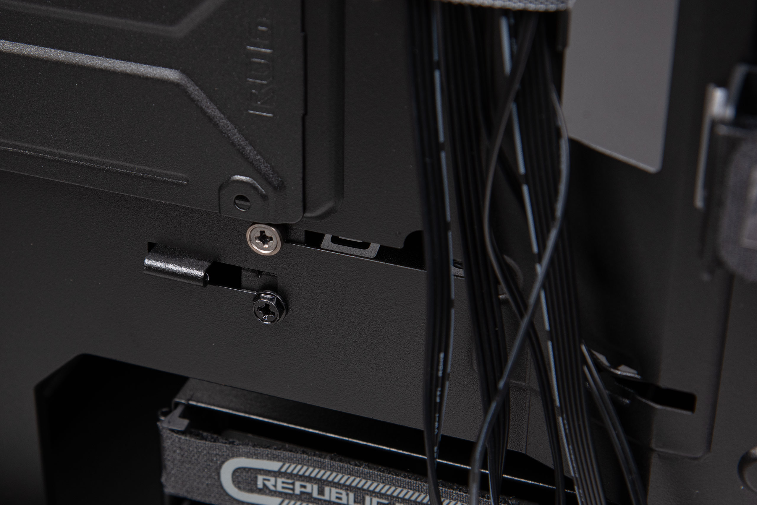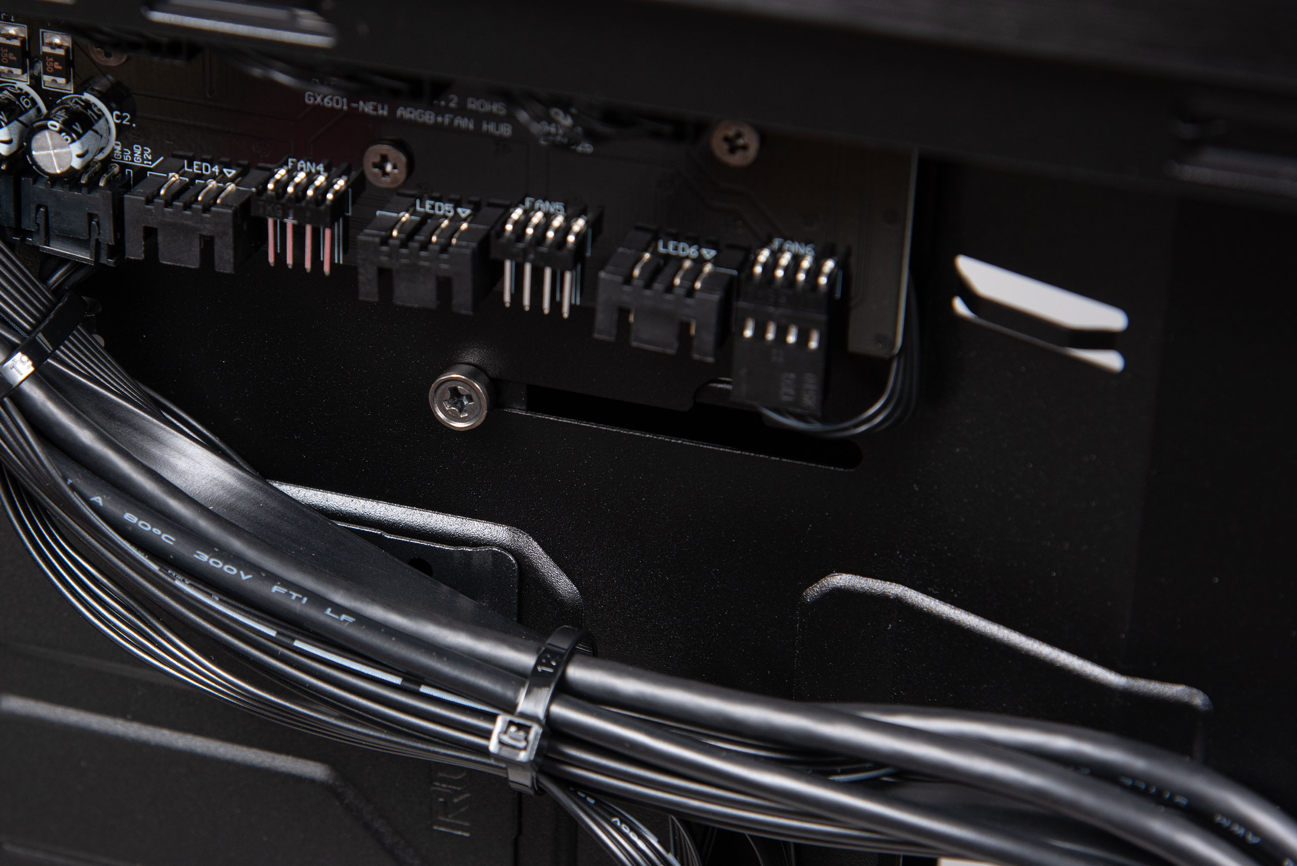 Но чтобы добраться до хаба и кабелей — нужно распахнуть пластиковую полупрозрачную накладку, которая накрывает большую часть боковой стороны корпуса. Она фиксируется на двух винтах, а при необходимости ее можно снять с петель, потянув вверх в открытом состоянии. Аналогичная крышка была и в прошлом ROG Strix Helios.
