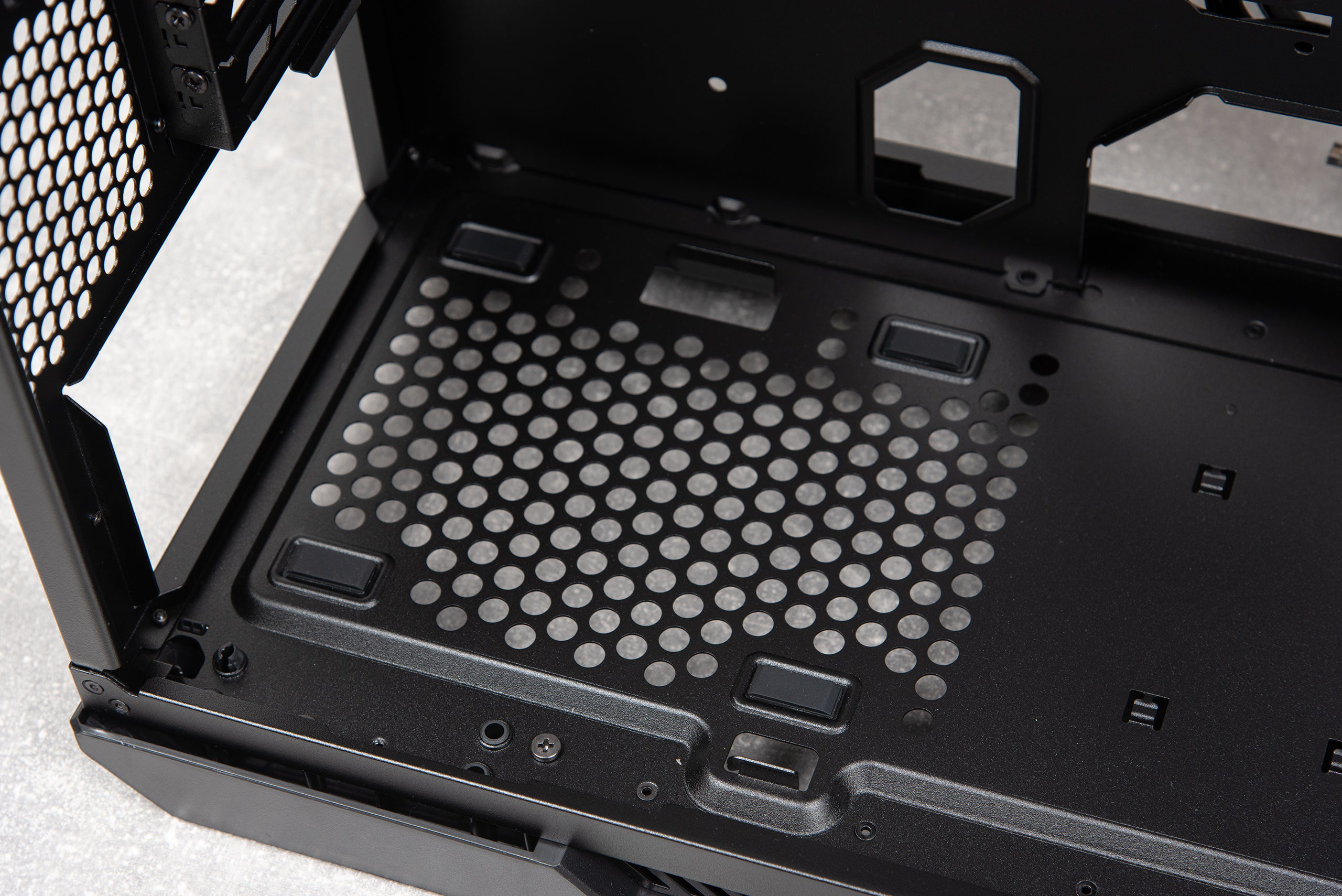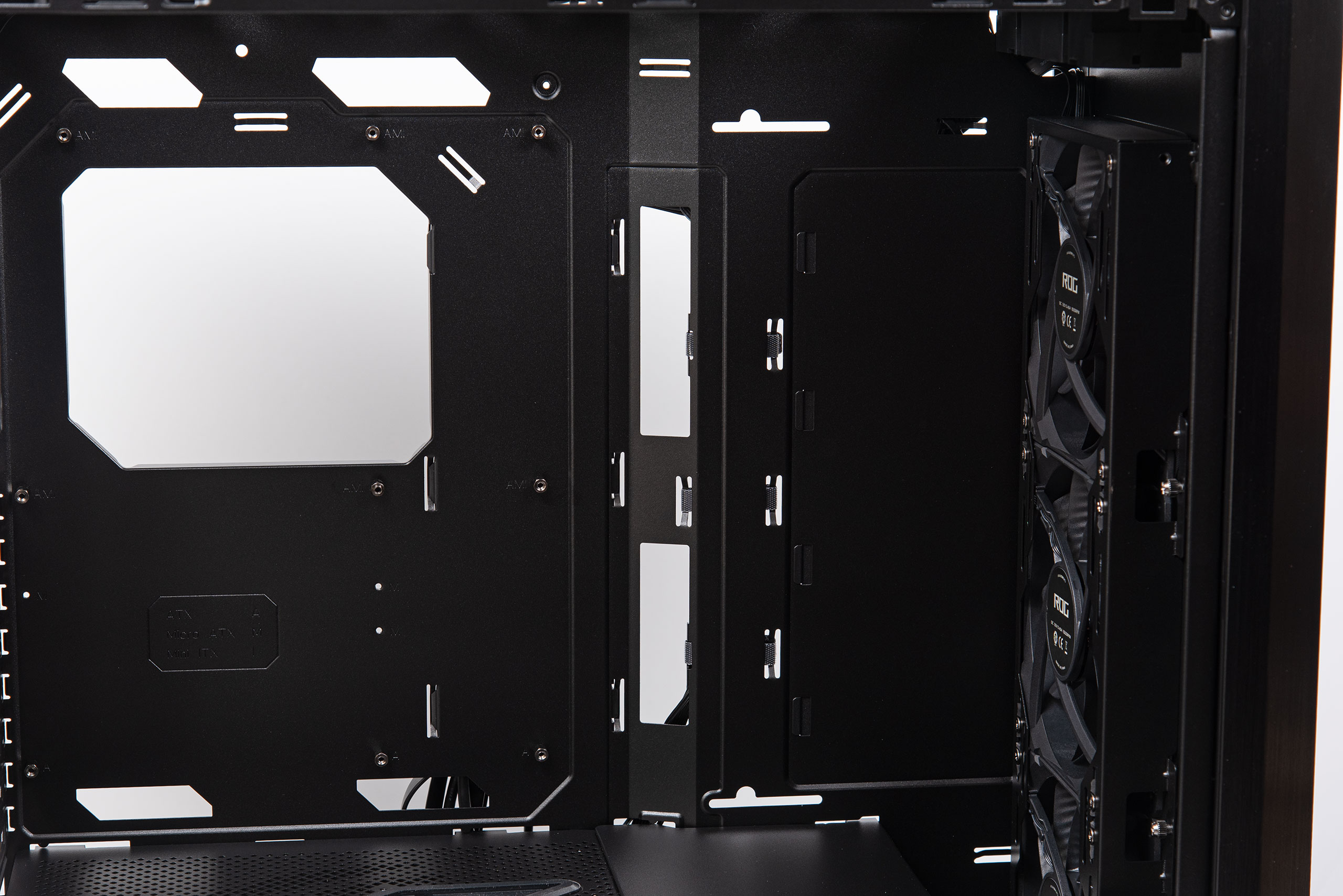 Шасси рассчитано на установку до семи 120-мм (шести 140-мм) вентиляторов, тогда как с завода корпус поставляется с четырьмя вертушками типоразмера 140×140×25 мм (скорость 1500 об/мин). Одна из них закреплена непосредственно на заднюю панель, а три на рамку, которая крепится к передней панели изнутри. Снизу возле них, в кожухе над корзиной для накопителей, есть просвет в 60 мм, который позволяет установить радиатор жидкостного охлаждения соответствующей толщины.