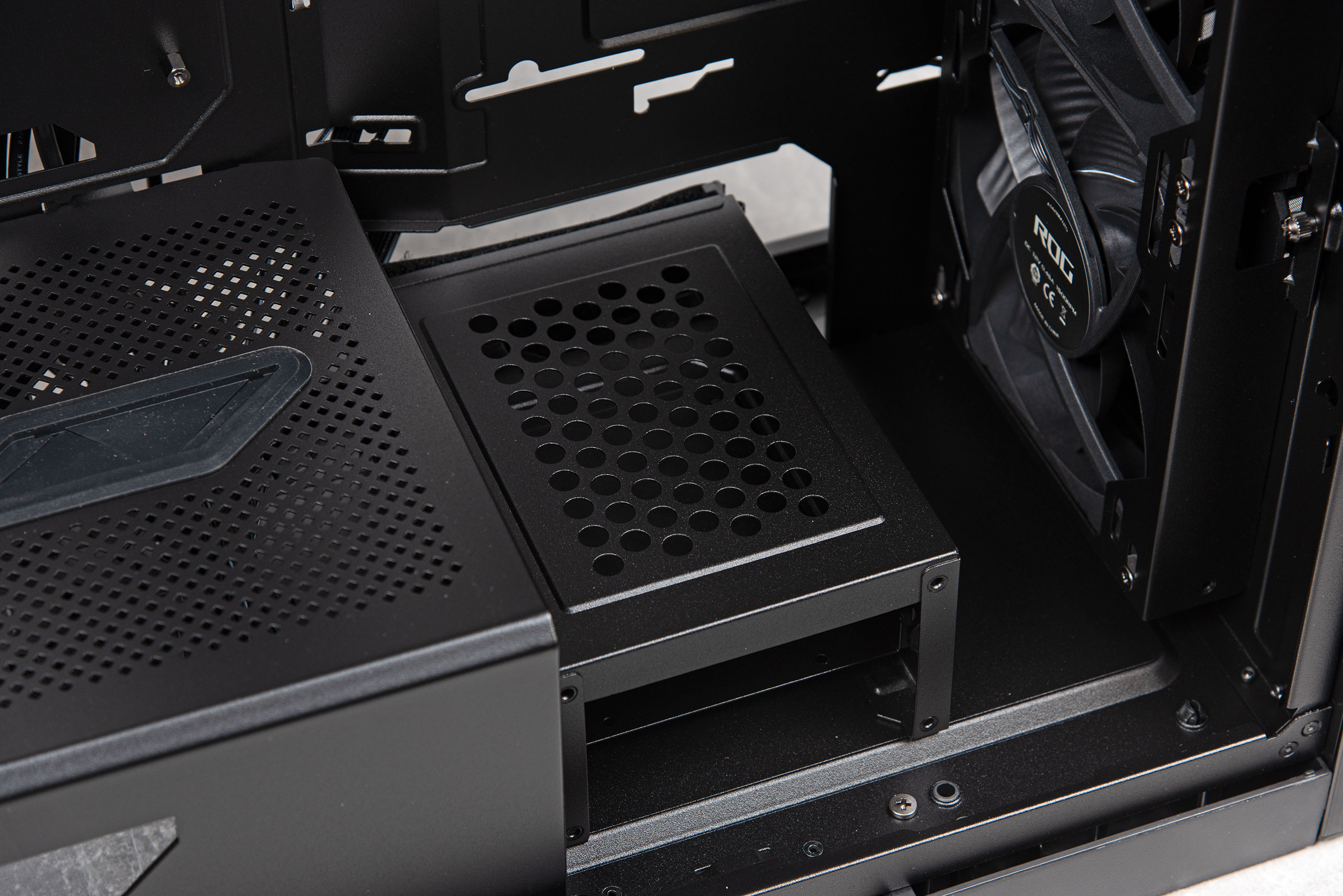Кожух над блоком питания имеет окошко и разделен на две части, которые легко снимаются, достаточно открутить несколько винтов. Как и в прошлой модели, установить блок питания можно либо сняв кожух, либо через заднюю панель, предварительно демонтировав рамку. Для уменьшения передачи вибраций в месте установки блока предусмотрены резиновые накладки.